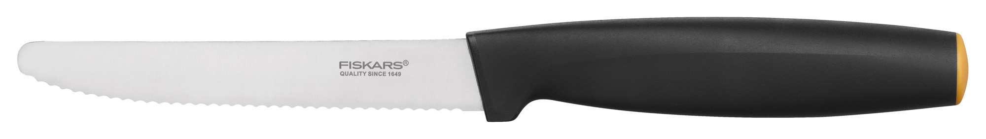 Описание: Удобный универсальный нож среднего размера с зубчатым лезвием для нарезания овощей и фруктов с тонкой кожурой. Также может быть использован для сервировки стола.