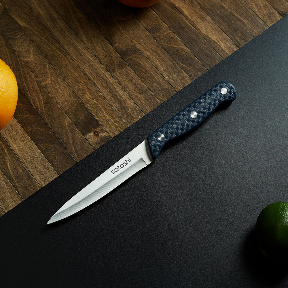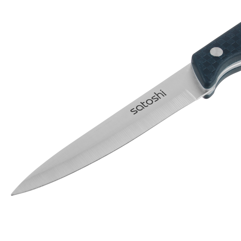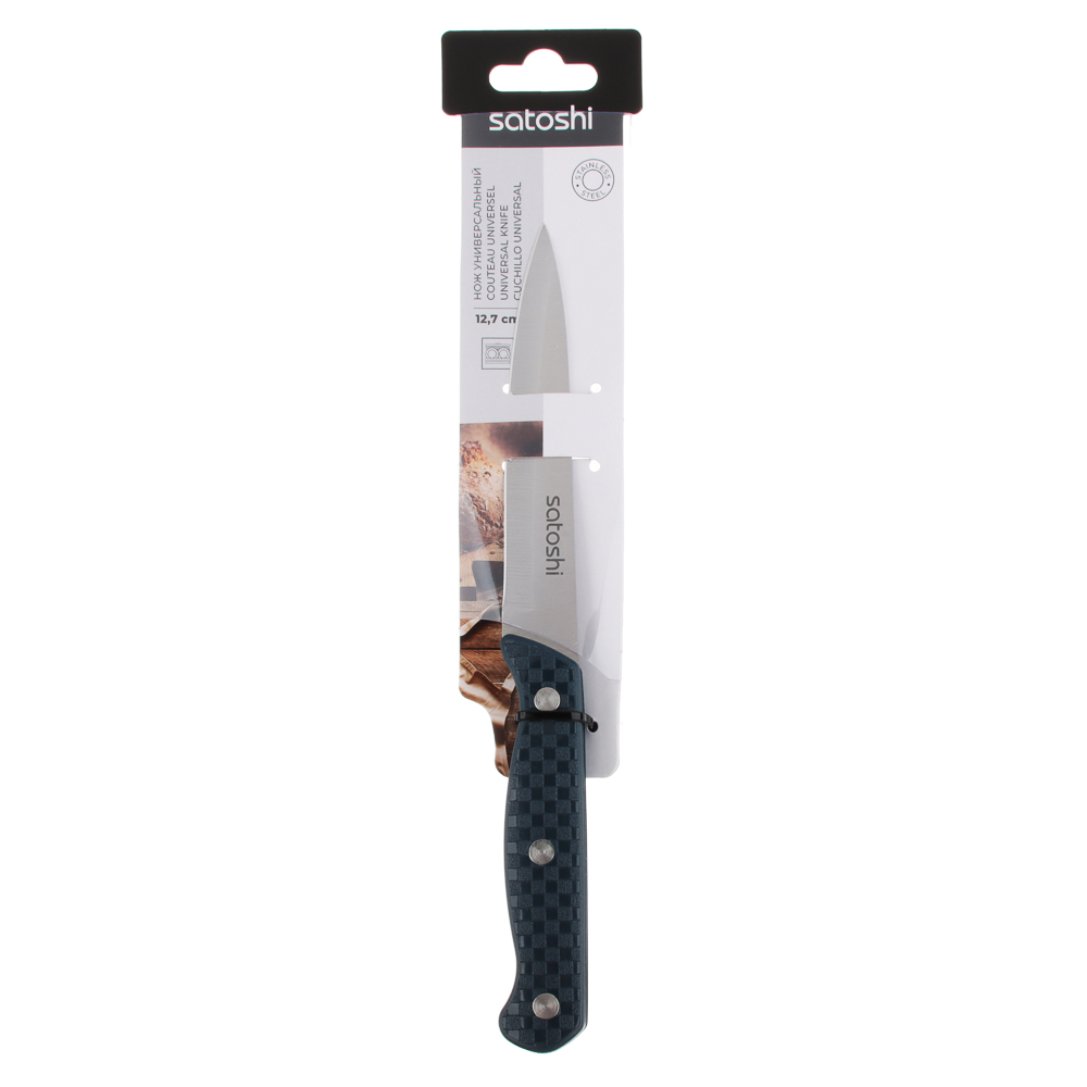 Кухонный нож SATOSHI Ривьера из нержавеющей стали размером 12,7 см — универсальный инструмент, которому под силу любая задача — от нарезки овощей до разделки куриного филе. Имеет эргономичную рукоять с покрытием Soft-Touch, благодаря чему изделие не выскальзывает из рук и не вызывает усталости даже при длительной работе по нарезке. Лезвие из нержавеющей стали долго держит заточку, не боится длительного контакта с кислотами, нож легко моется. Имеет строгий стильный дизайн.