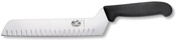 Описание: Клинок ножа имеет рифления вдоль режущей кромки, что позволяет делать нарезку толщиной с бумагу и предотвращает прилипание продукта к лезвию ножа. Маленькие воздушные карманы, образующиеся при нарезке, делают отделение продукта от ножа легким и не требующим применения пальцев.