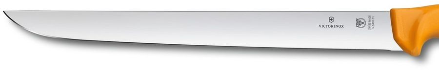 Длинный мясницкий нож с прямым обухом. Большая длина ножа позволяет легко и быстро нарезать куски стейков или нарубить достаточное количество котлетной массы.