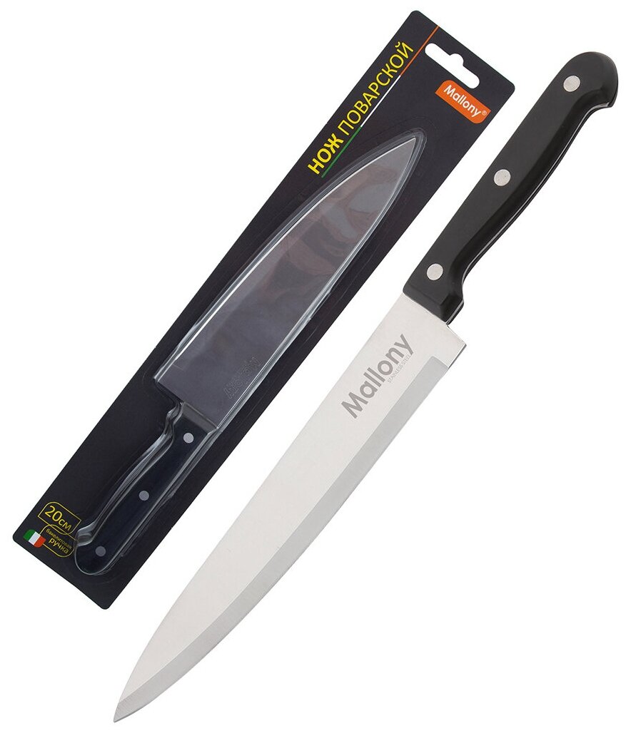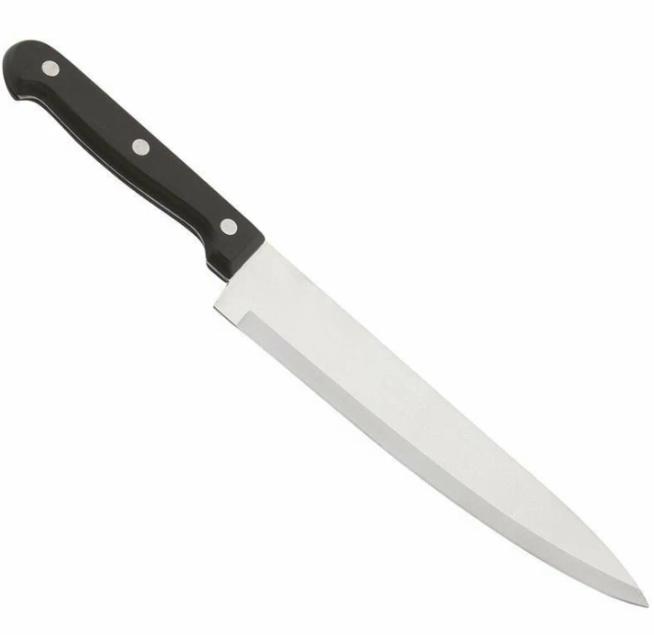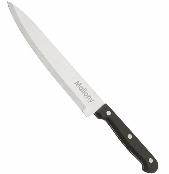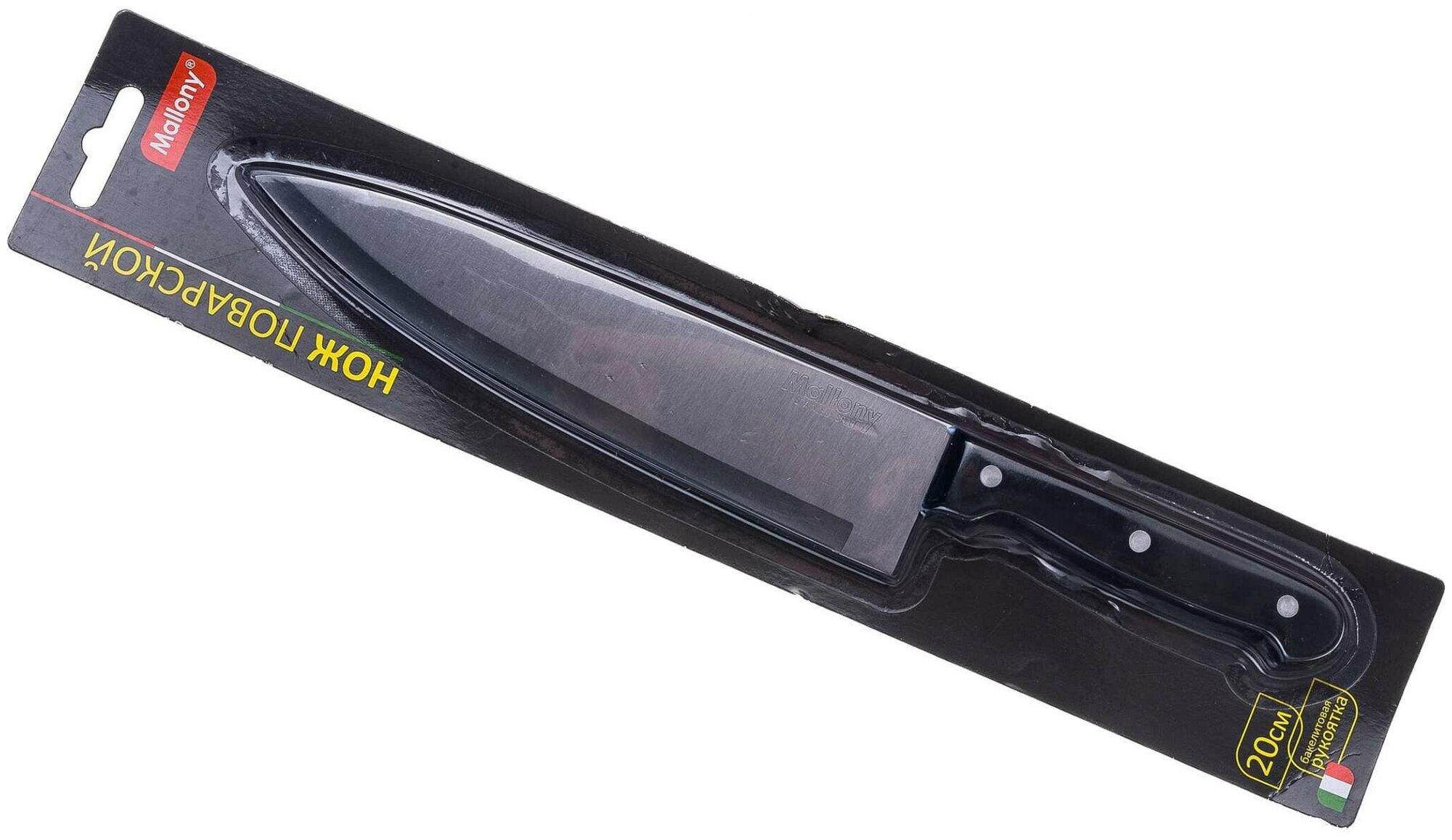 Нож с бакелитовой рукояткой подойдет для эксплуатации в быту, на кухне, в местах общественного питания.