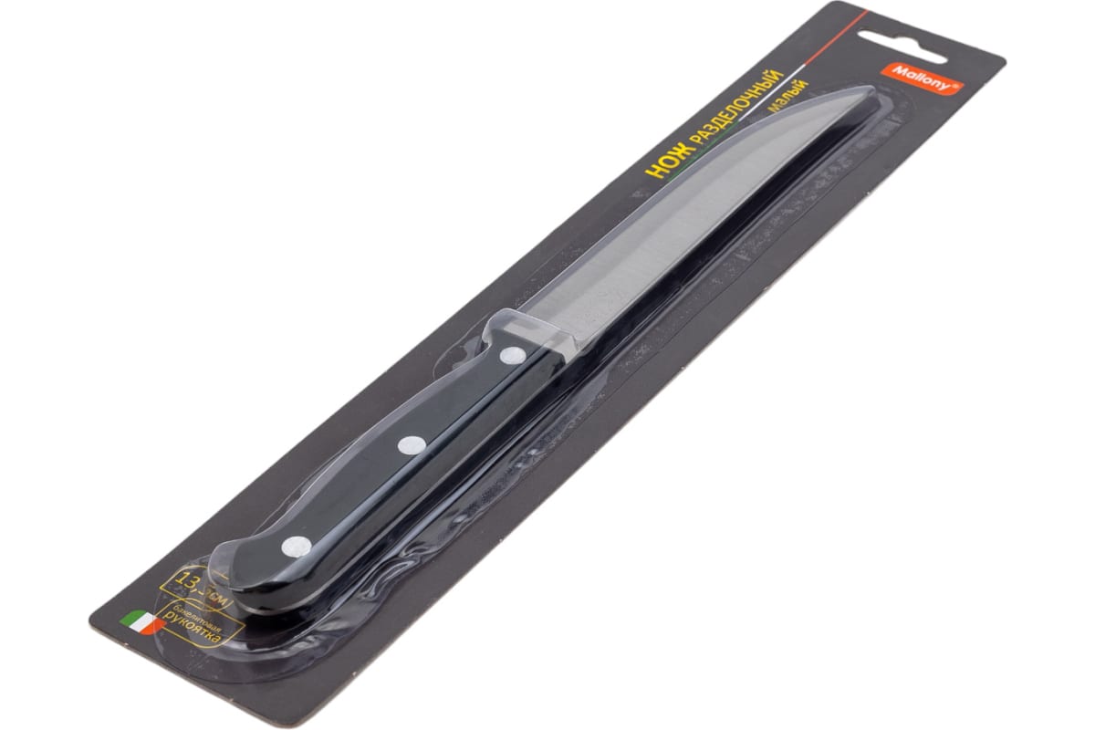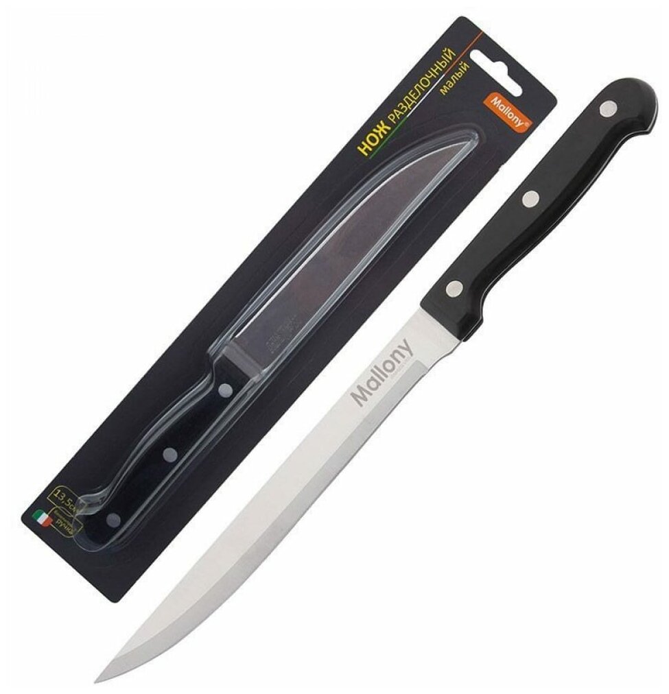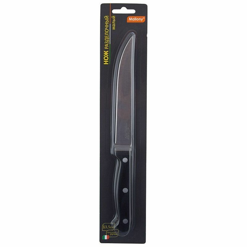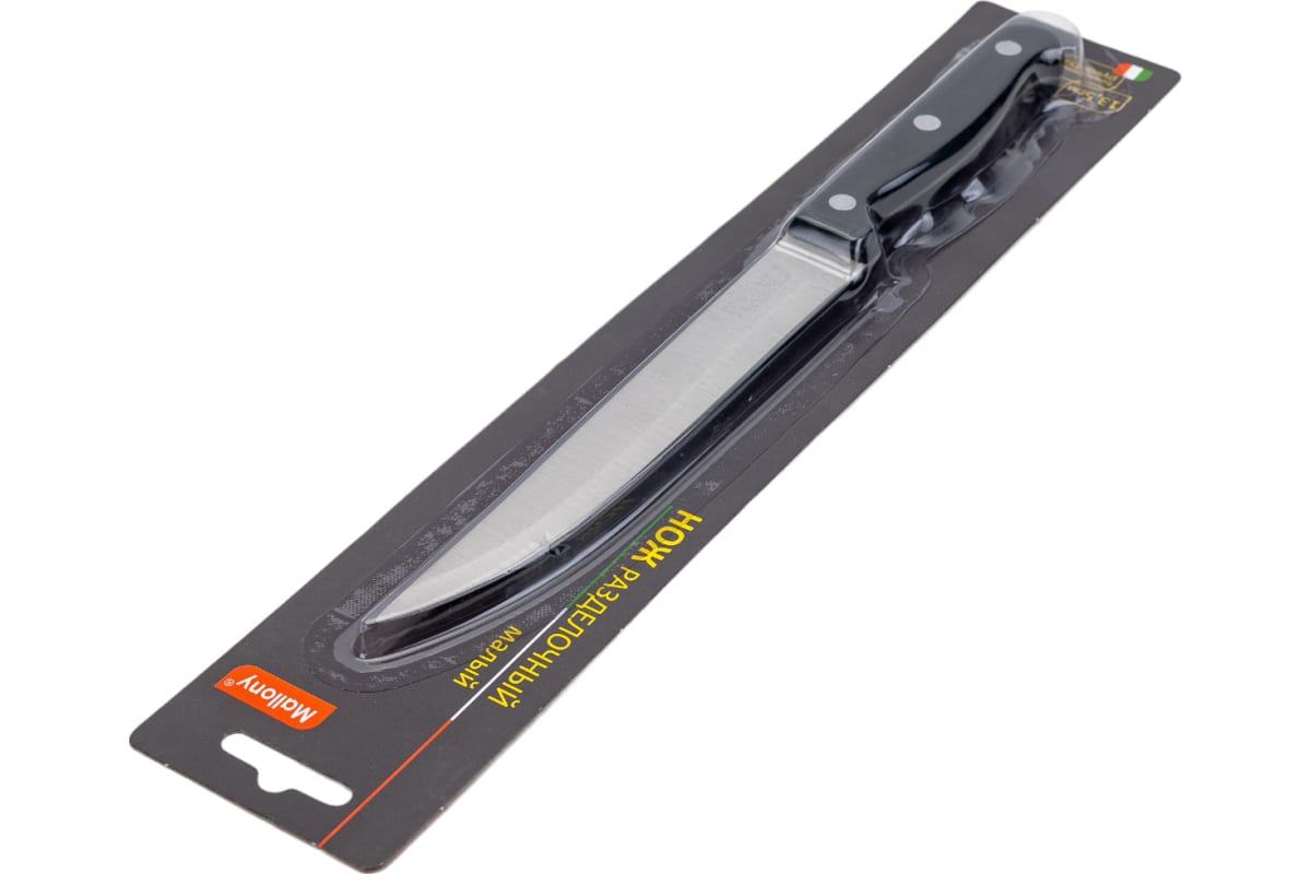 Нож с бакелитовой рукояткой изготовлен из прочной стали. Толщина клинка составляет 1.2 мм.