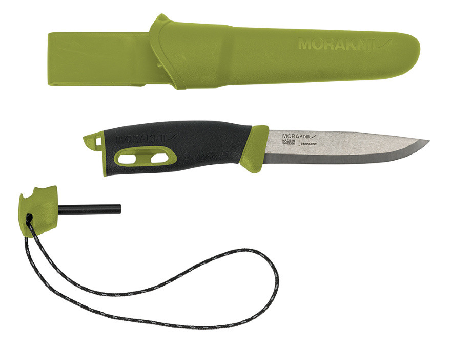 Особенности: Пластиковые ножны с поясной петлей. Огниво фиксируется в рукояти. Светоотражающий паракордный шнур 475 мм