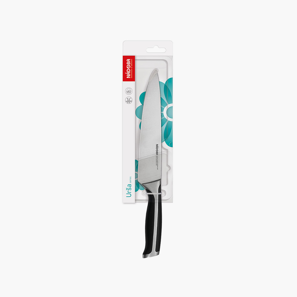 Кухонные ножи серии Ursa изготовлены из высококачественной нержавеющей стали премиум-класса, лезвия ножей остаются острыми очень долгое время. Ручки ножей выполнены из кованой нержавеющей стали и прочного бакелита. Блок набора ножей, входящего в серию, изготовлен из натурального дерева (гевея) и оснащён встроенной ножеточкой. Ножницы из набора оснащены открывалкой для бутылок.