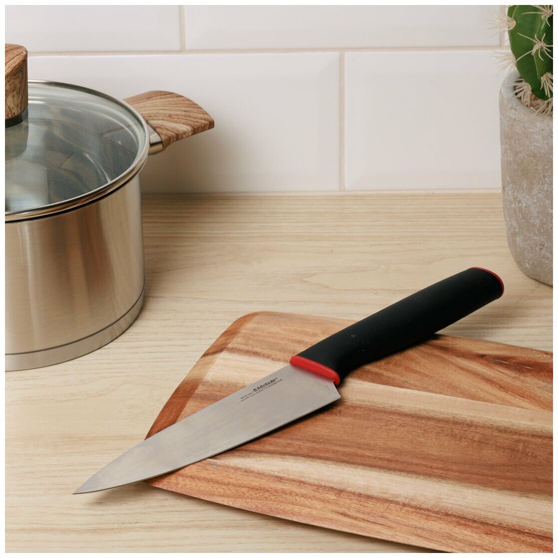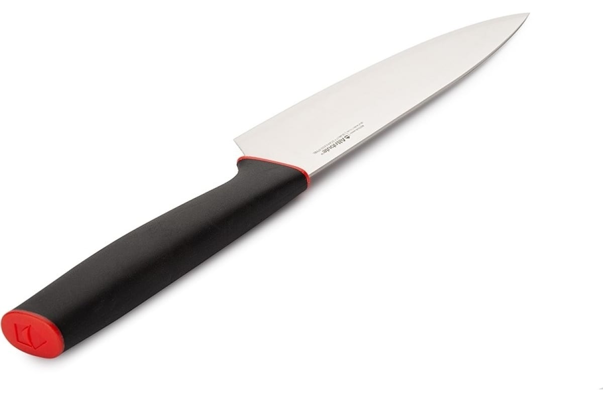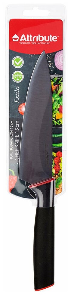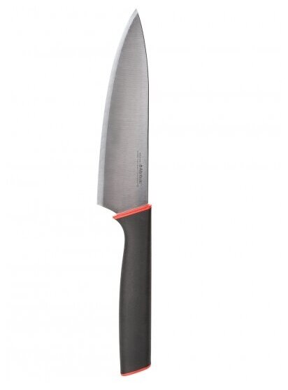 Нож поварской - универсальный кухонный нож общего применения, предназначенный для нарезки и шинковки различных продуктов и полуфабрикатов. Специальная форма лезвия из нержавеющей стали позволяет совершать действия по нарезке комфортно и удобно. Пластиковая ручка более износостойкая в отличии от деревянной ручки. Так как пластик более удобен в уходе, более легкий и благодаря своей структуре намного меньше скользит в руке. Нож можно мыть в посудомоечной машине.