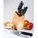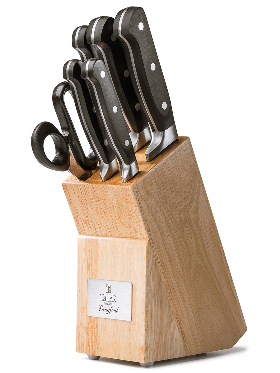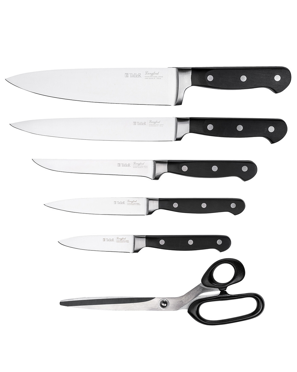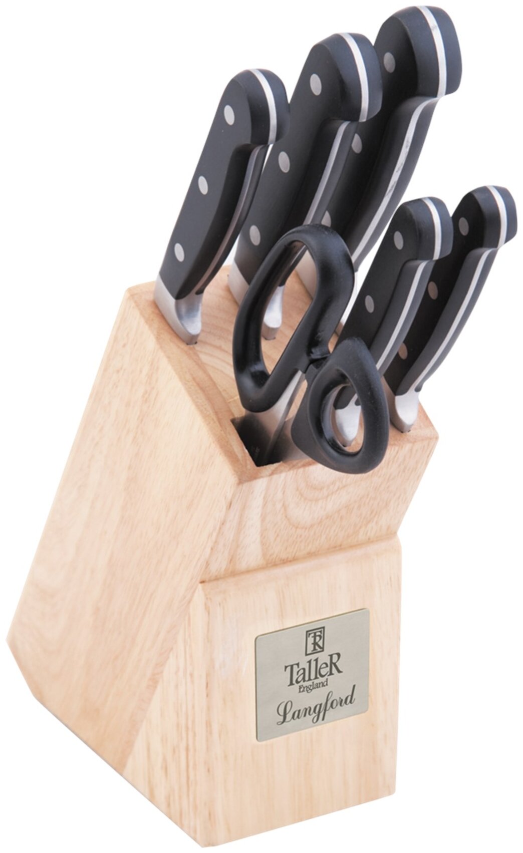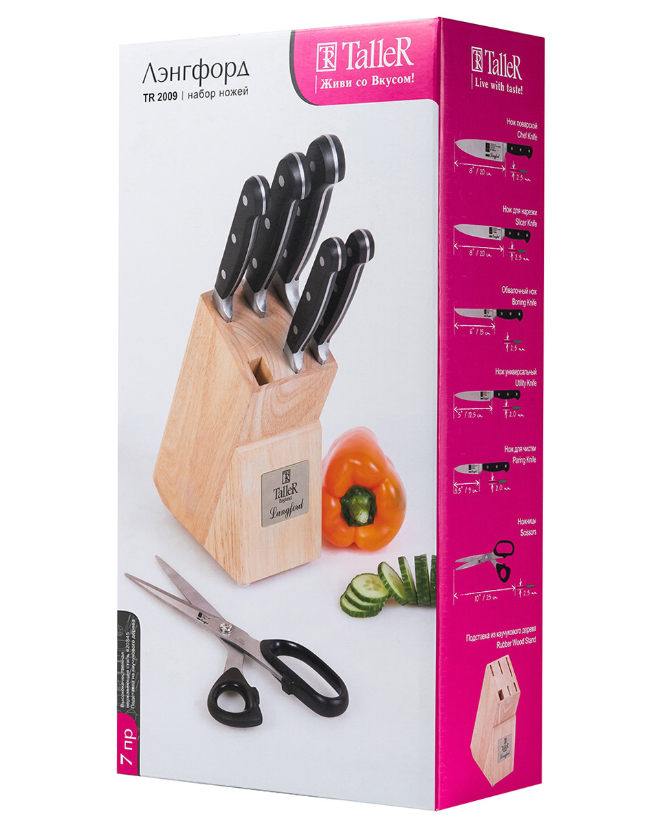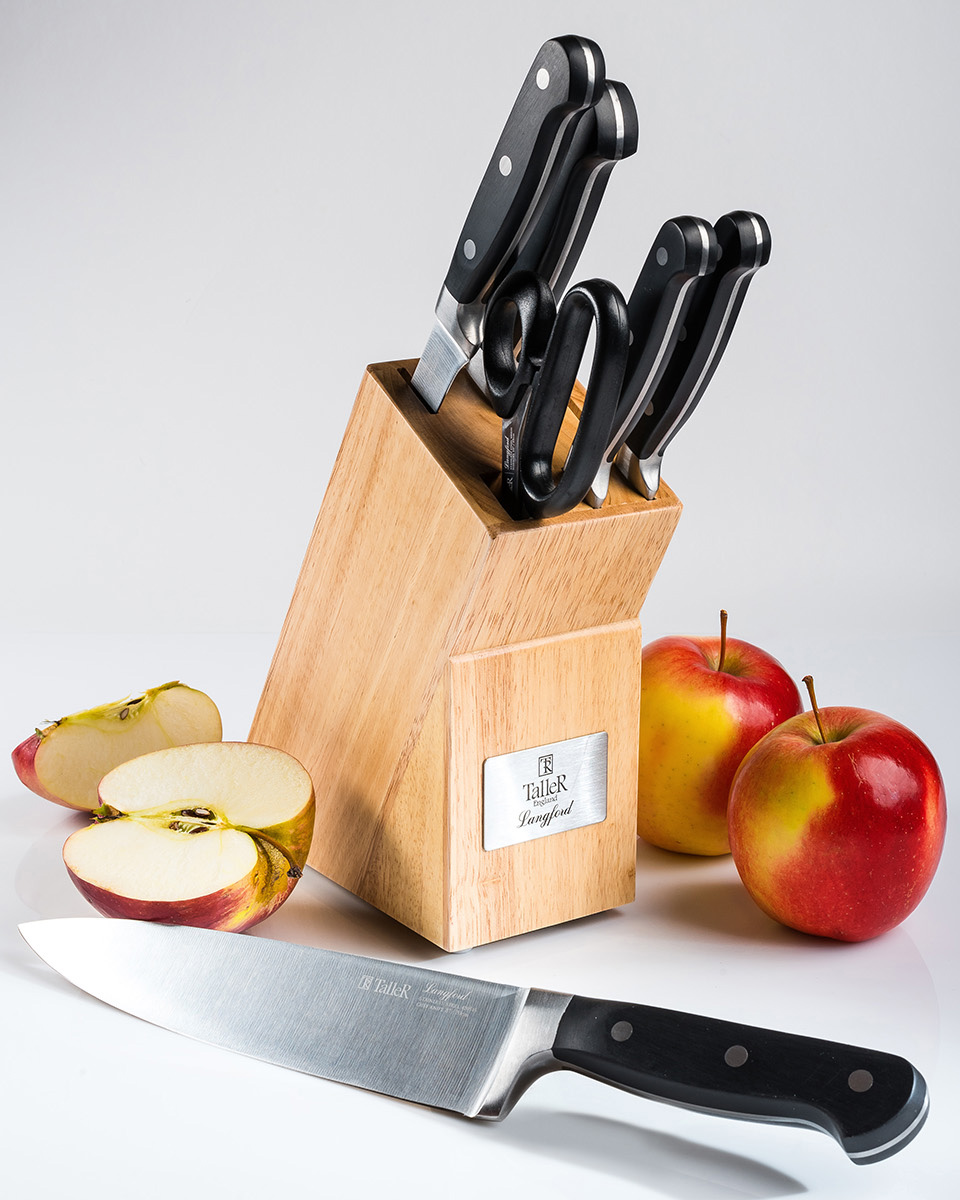 Пять ножей и ножницы, помещённые в удобную и стильную подставку, выполненную из каучукового дерева. В ней кухонные инструменты всегда будут в свободном доступе.