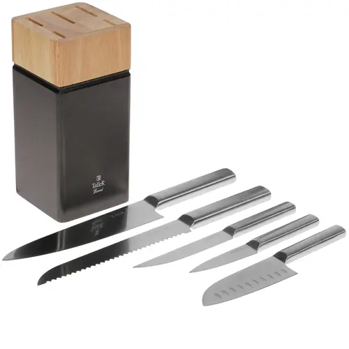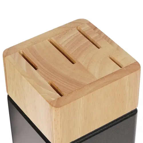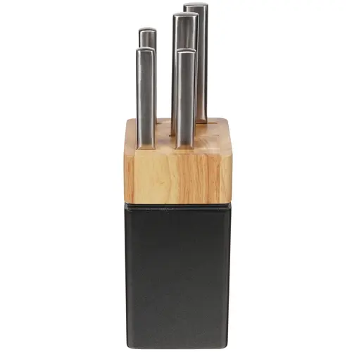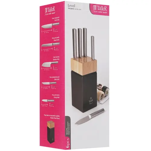 С таким арсеналом получится справиться с разделкой любого продукта и приготовлением какого угодно блюда. Острая заточка позволяет делать красивые, ровные разрезы даже таких сложных в этом отношении нежных тортов или суши. Для ножей есть прочная, стильная деревянная подставка, не повреждающая лезвия.