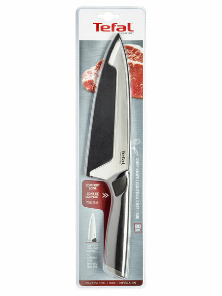 Кухонный нож TEFAL K2213204 2100121737 стальной универсальный лезвие 200 мм прямая заточка серебристы 1841208 предназначен для бытового использования.