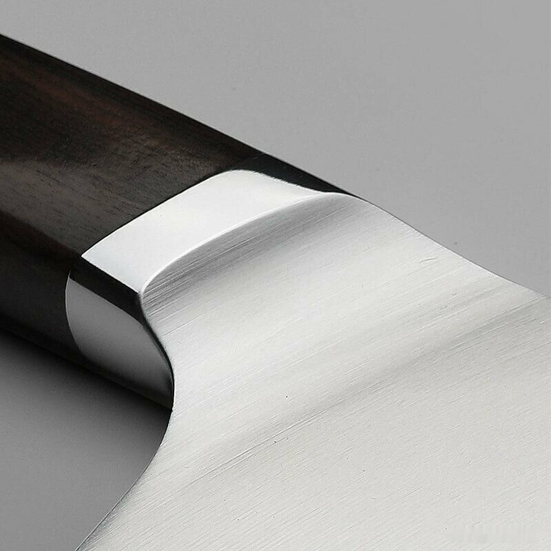 Нож-тесак имеет привлекательный дизайн, эргономичную ручку из черного дерева и трехслойное строение стали.