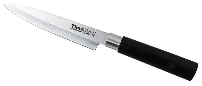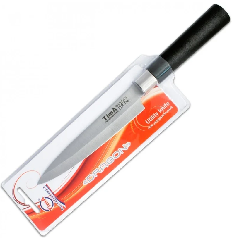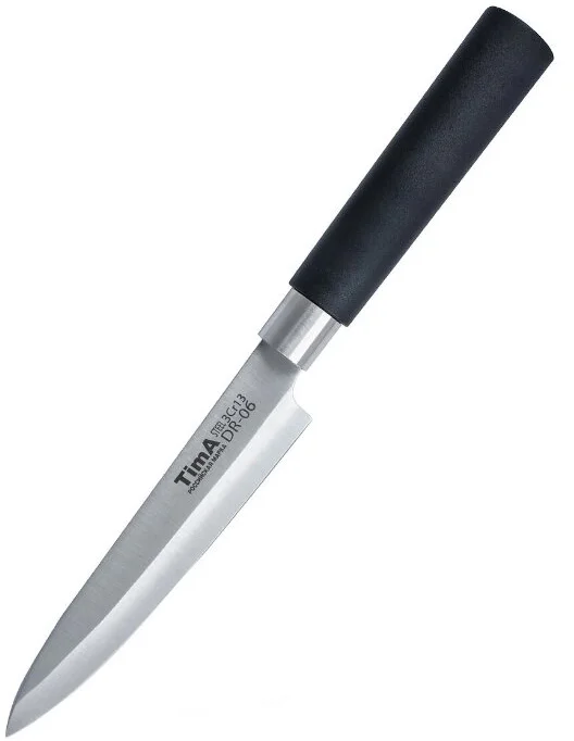 Универсальный нож изготовлен из высококачественной ножевой стали 3Cr13 в японском стиле. Твердость стали примерно 57 HRC. Ручка цилиндрической формы изготовлена из матового полипропилена и не скользит даже в мокрой руке. Высокое содержание хрома (13%) не только увеличивает твёрдость и износостойкость, улучшая тем самым режущие свойства лезвия, но и придаёт стали антикоррозийные свойства. А благодаря повышенному содержанию углерода лезвие прекрасно держит режущую кромку.