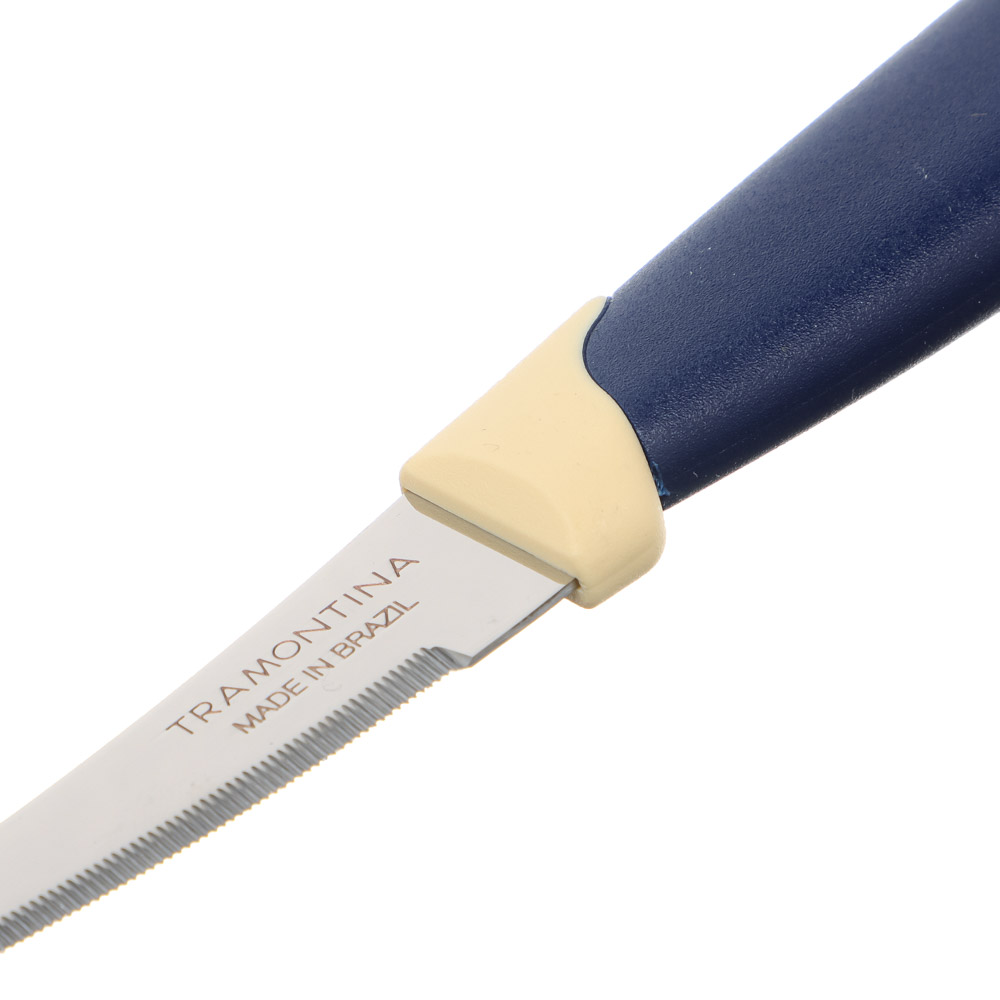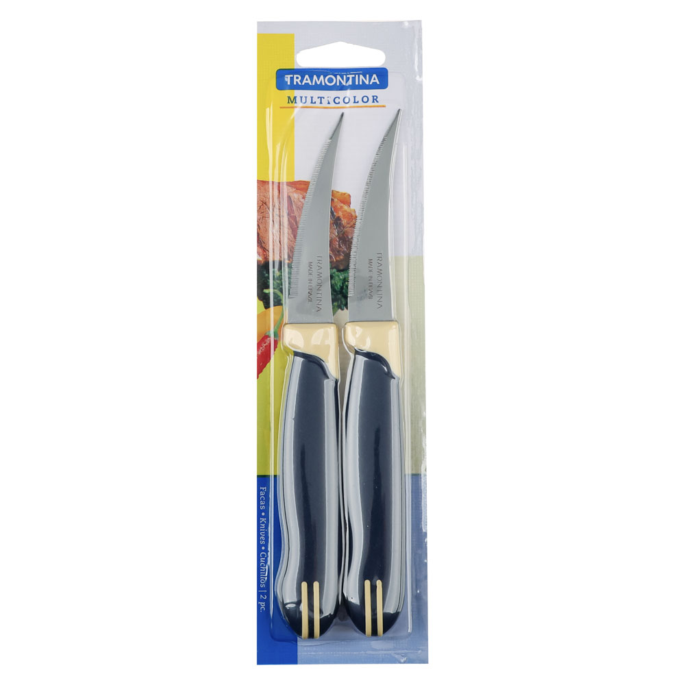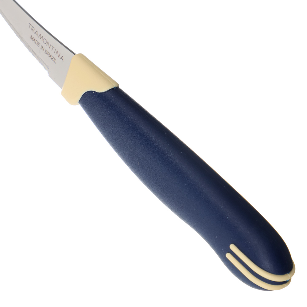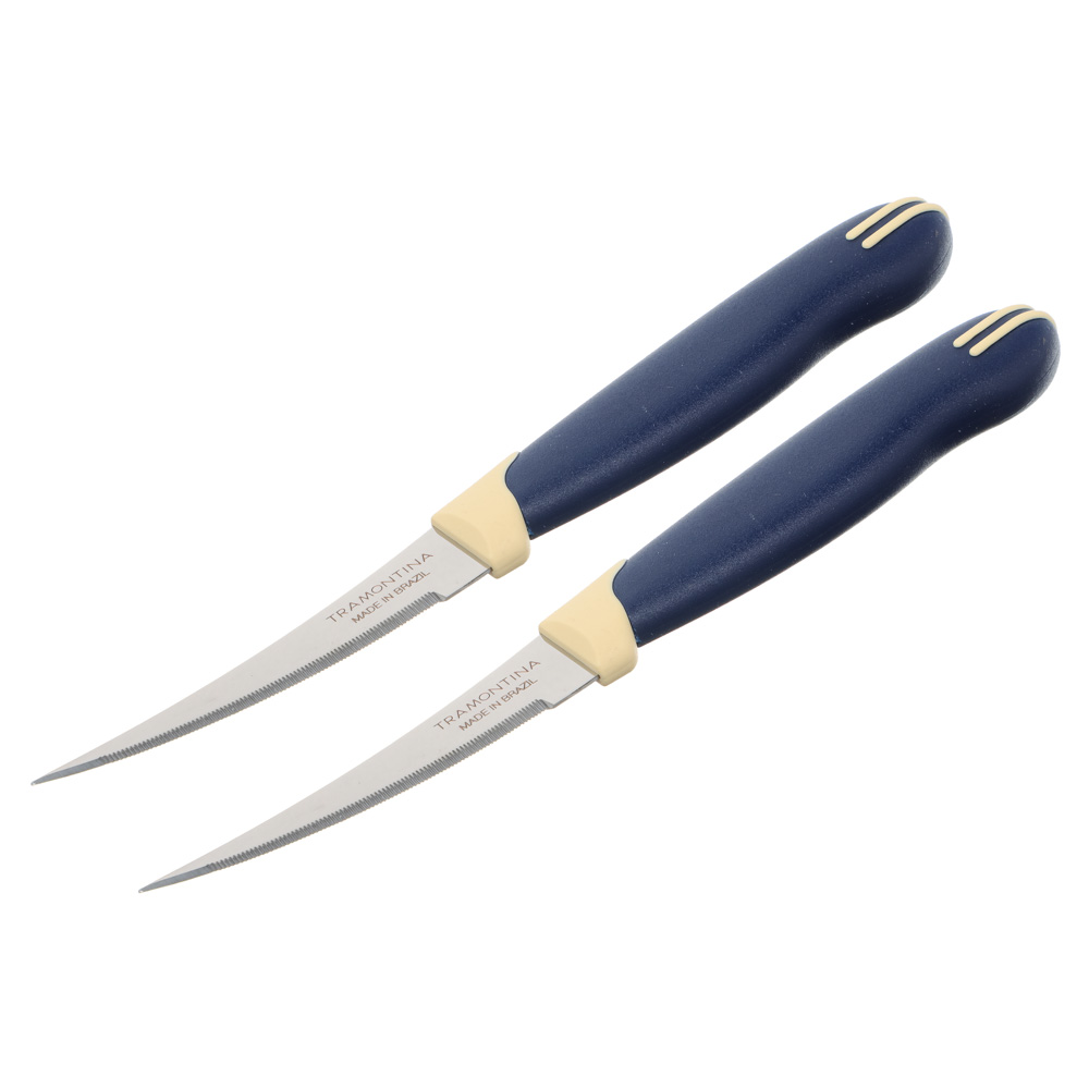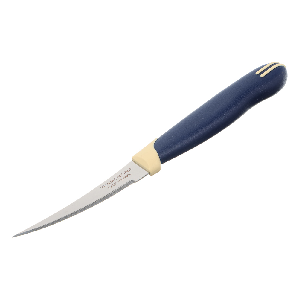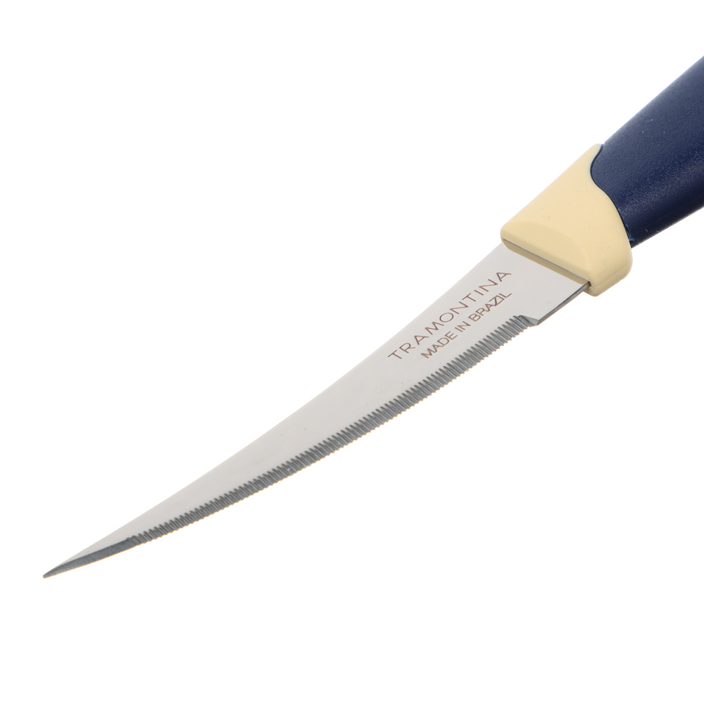Нож для томатов 8 см значительно упростит процесс нарезки помидоров. Зубчатая кромка помогает легко и с минимальным нажимом прорезать кожицу томата, не повреждая и не сминая сочную мякоть. Качественная нержавеющая сталь не боится коррозии, а ручка не подвержена окрашиванию и не накапливает запахи. Нож подходит для нарезки любых овощей и фруктов с плотной кожицей. 2 шт. в блистере.