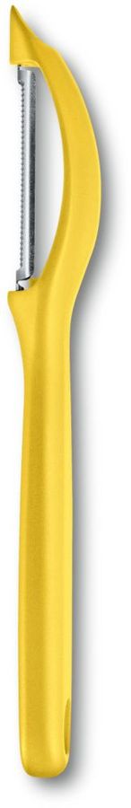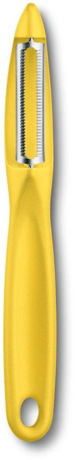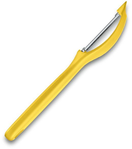 Универсальная овощечистка с эргономичной ручкой красного цвета и зазубренным краем лезвия, что позволяет легко снимать кожуру, а острый наконечник с легкостью удалит глазки с картофеля.