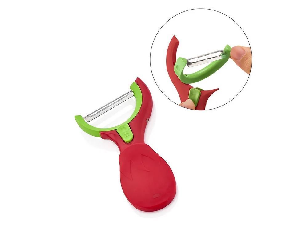 Овощечистка пластиковая с металлическим стальным ножом Qluх. Овощечистка с подвижной головкой, которую можно использовать как по вертикальной, так и по горизонтальной оси. Вы можете вращать наконечник, нажимая среднюю кнопку. Имеет эргономичный дизайн. Подходит для мытья в посудомоечной машине.