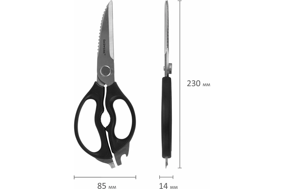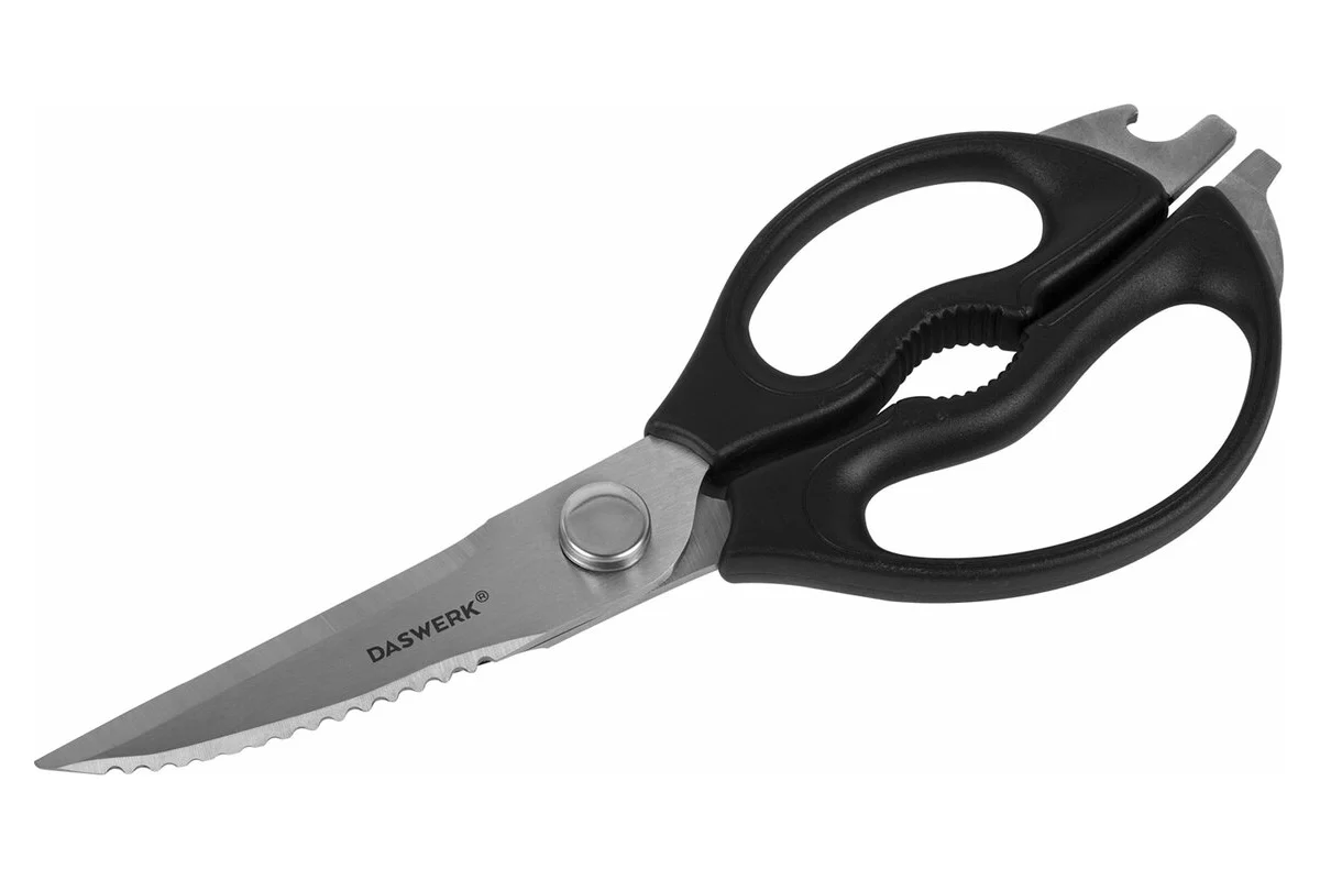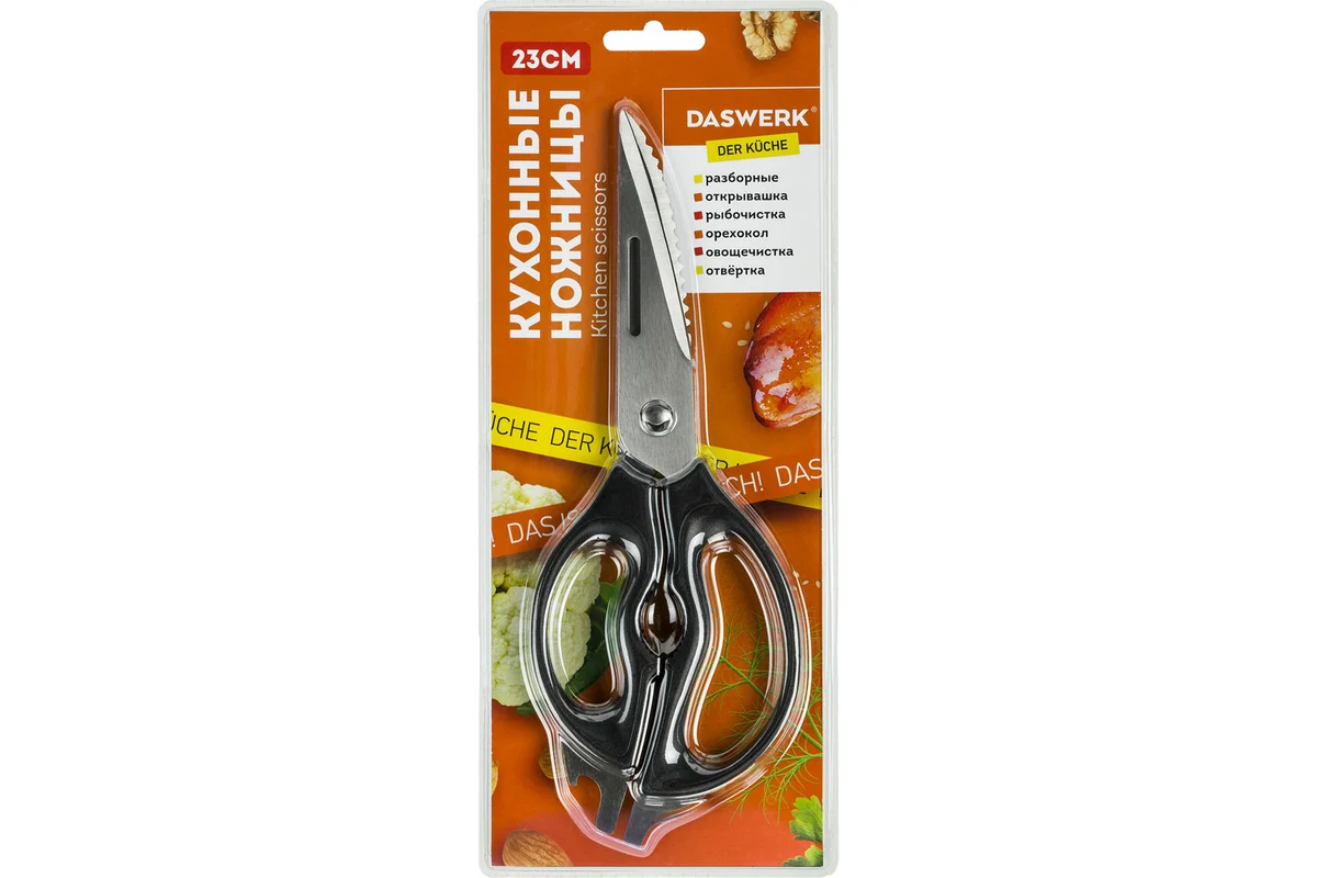 Кухонные ножницы DASWERK, 230 мм, разборные, с открывашками, зазубренные сочетают в себе максимальную функциональность и прочность, становясь незаменимым аксессуаром для кухни.