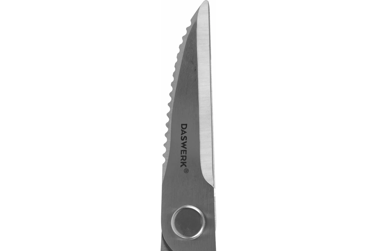 Ножницы DASWERK отлично подойдут для разделки рыбы и мяса птицы, нарезки овощей, зелени и пиццы, а также для резки бумаги, картона и текстильных материалов.