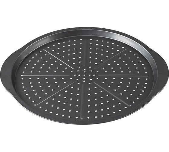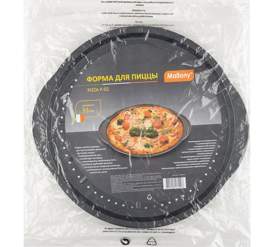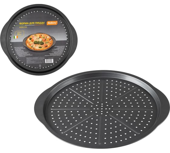 Форма для пиццы Mallony PIZZA P-02 диаметр 33 см для удобства использования снабжена ручками. Перфорированное дно обеспечивает более быстрое и равномерное пропекания теста. Антипригарное покрытие исключает необходимость использования большого количества масла.