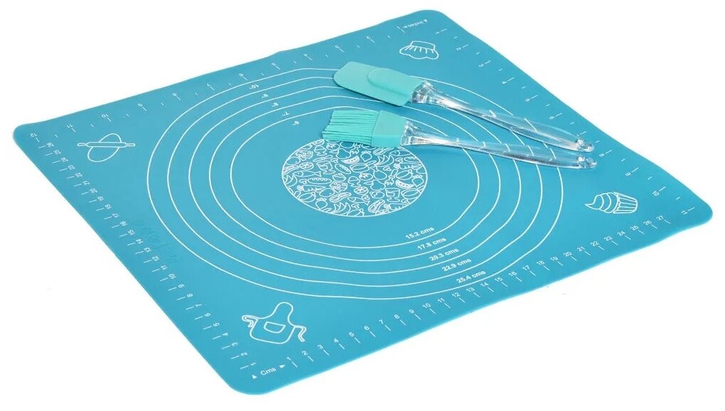3 предмета: - кисточка (18*3 см), 13 гр- лопатка (17*3 см), 15 гр- коврик для раскатки теста однотонный, с разметкой (30*33 см, толщина 0,6 мм), 85 гр. Лопатка гибкая предназначена для равномерного распределения крема, масла, соуса или начинки. Кисточка предназначена для смазывания поверхностей посуды, а также продуктов перед запеканием или жаркой. Температура использования от -60°С до +260°С