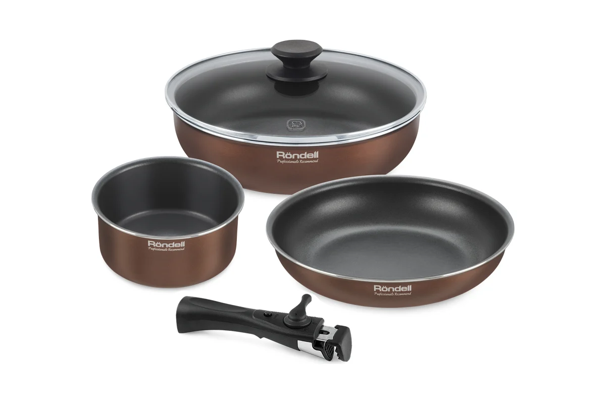 Сковорода 24x5 см, сотейник с крышкой 26x7.3 см, ковш 16x8 см, съемная ручка
