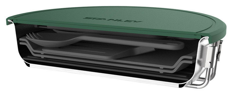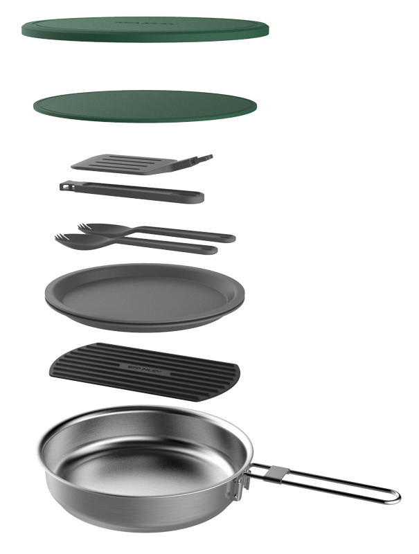 Состав комплекта: Сковорода Stanley Adventure 0,96 L. Разделочная доска. 2 тарелки 15,2 см. 2 вилки. Лопатка. Силиконовая подставка.