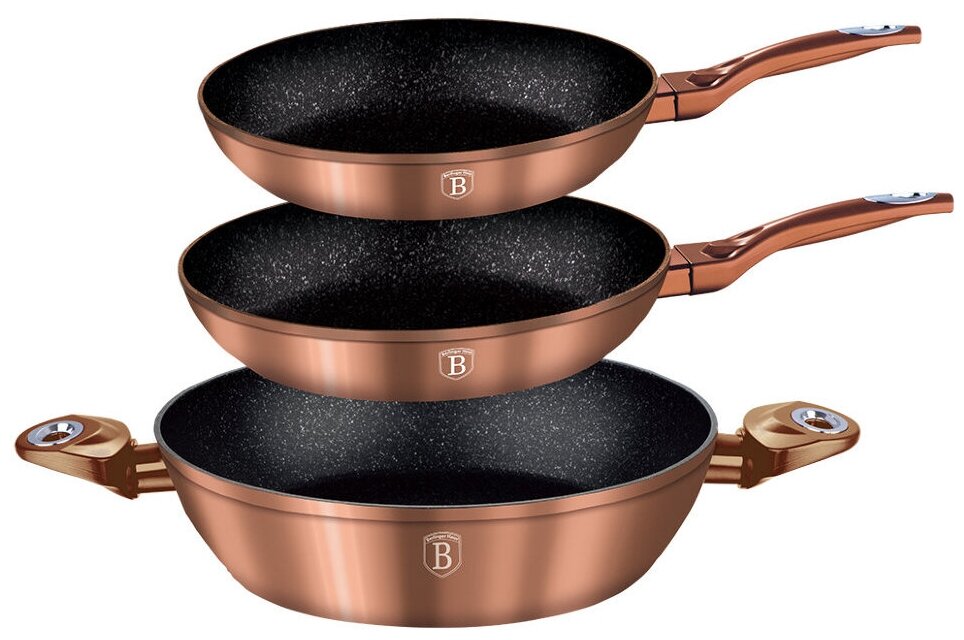 высота стенок: сковороды 4.2 см, 5 см, сотейник 7 см; 3 слоя мраморного покрытия эргономичная ручка soft touch