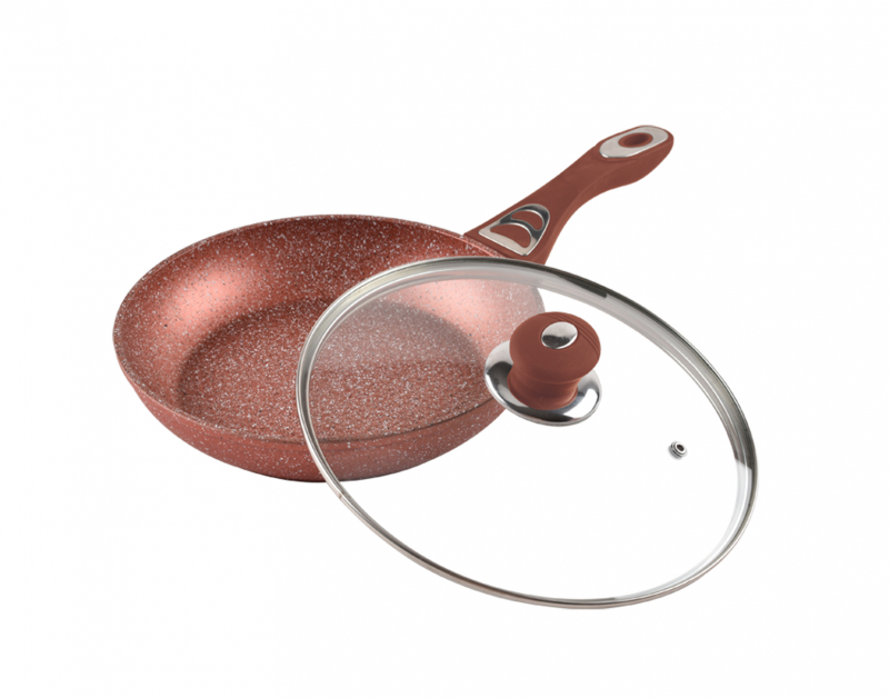 26см с крышкой, толщина стенки 2,5мм, дна 4,5мм, высота 4,5см. Внутри 3-х слойное мраморное антипригарное цветное покрытие с рельефом, снаружи 3-х слойное мраморное жаропрочное цветное покрытие. Ручка с силиконовым покрытием в цвет сковороды. Индукционное дно. Подходит для всех видов плит и чистки в посудомоечной машине. Состав: кованый алюминий.