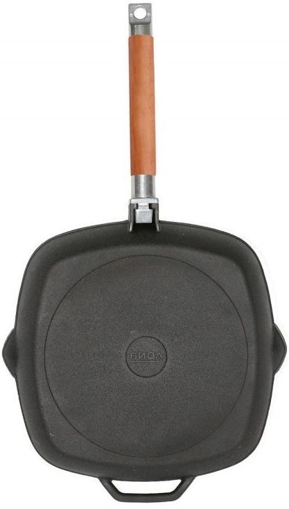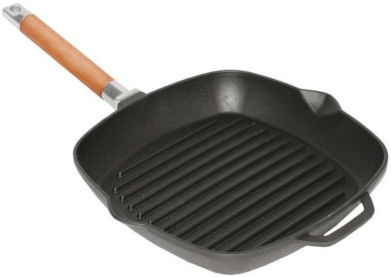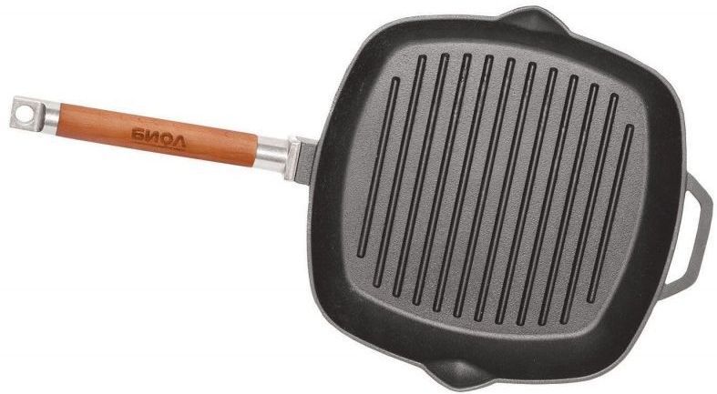Чугун, из которого сделана сковорода-гриль БИОЛ 10241, прекрасно удерживает температуру. Поэтому приготовленная на ней еда будет долго оставаться теплой. Данная модель подходит для индукционных и других видов плит. Если убрать съемную деревянную ручку, то сковороду можно использовать для приготовления блюд в духовке.