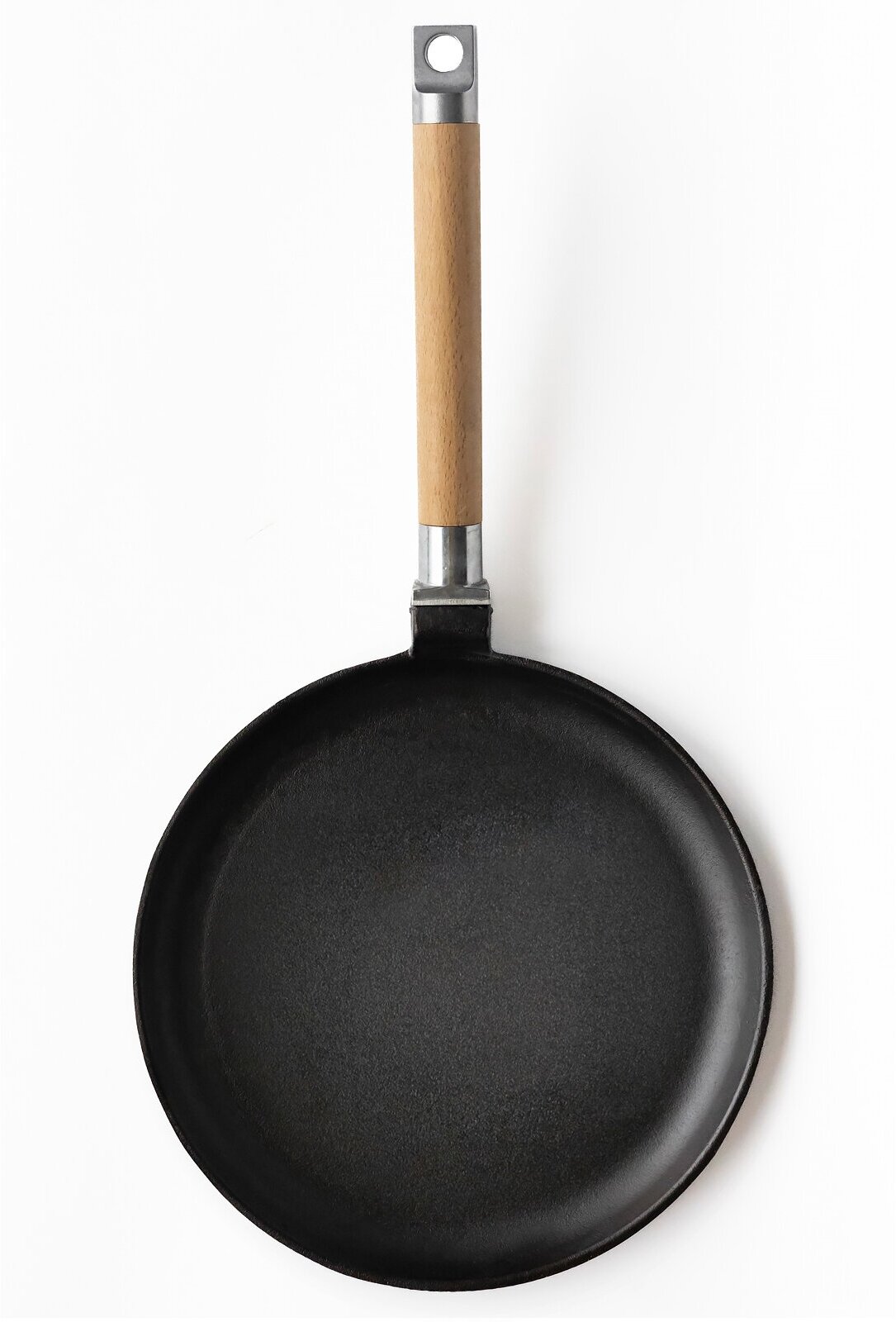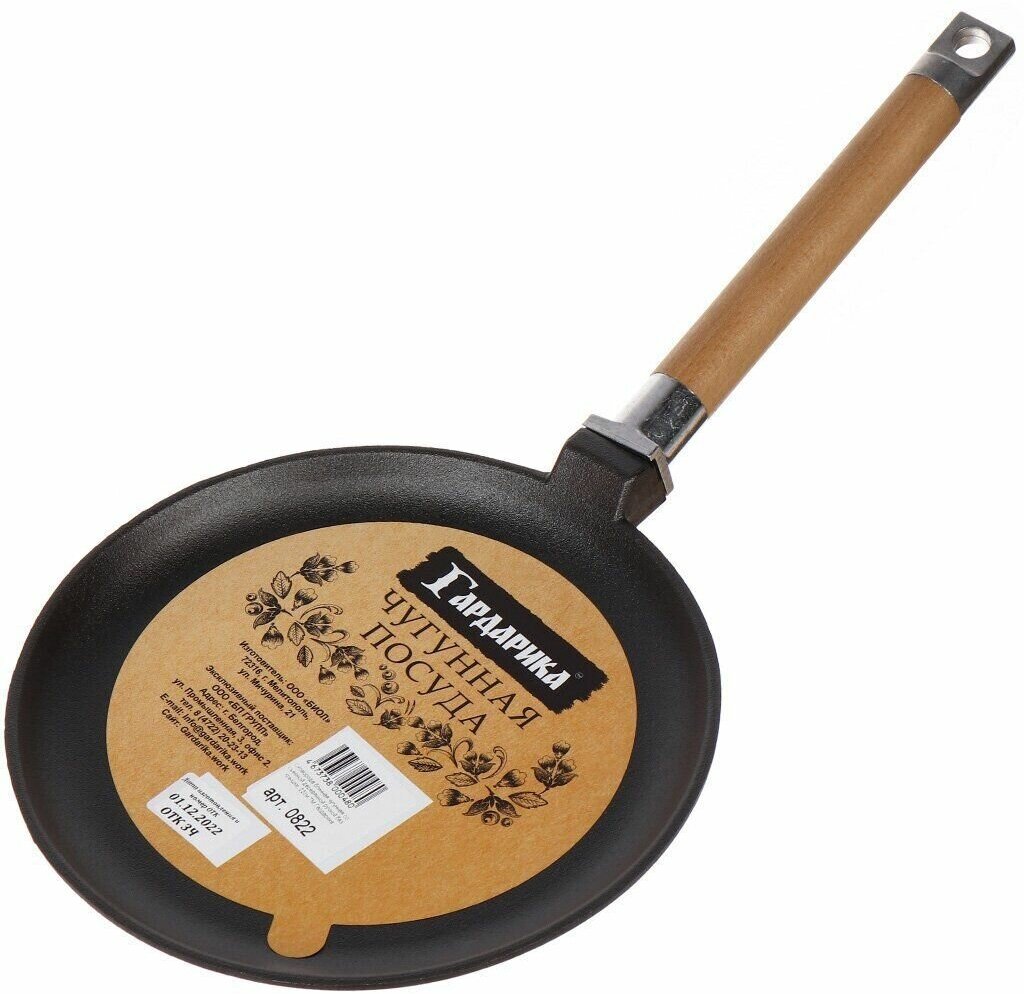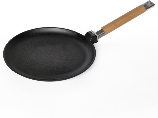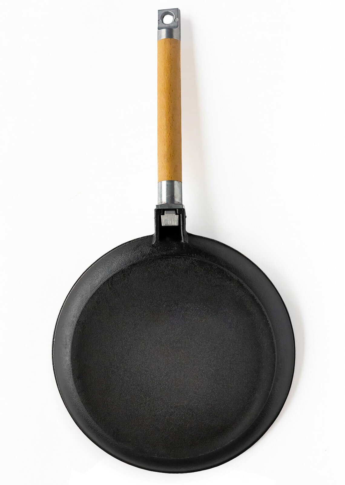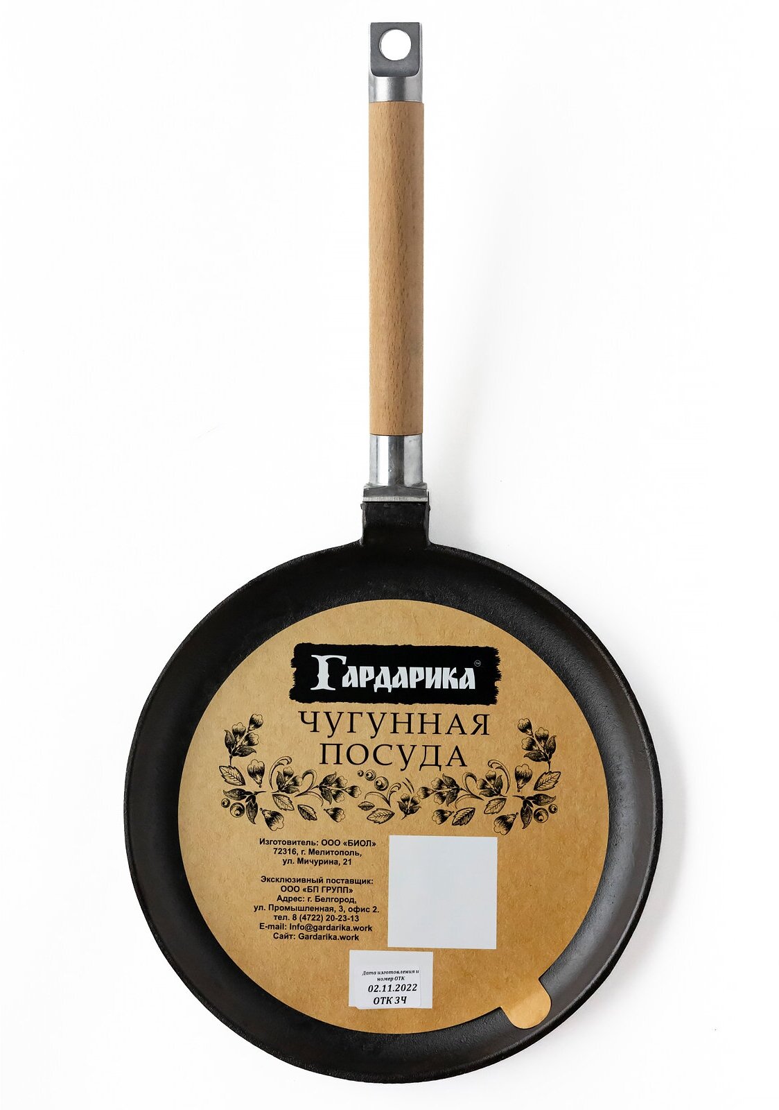Сковорода блинная Гардарика чугунная, съемная ручка, 22см. Надежная система крепления деревянной ручки позволяет использовать и без того тяжелую чугунную посуду не опасаясь, что ручка подведет в самый не подходящий момент. Кроме того, при условии снятой ручки посуду можно использовать в духовом шкафу или просто компактно ее хранить. В чугунных сковородах Гардарика ручка снимается путем раскручивания зажимного элемента встроенного в саму ручку. Такая Фиксация наиболее надежная, но она не самая удобная в плане присоединения и снятия ручки. Процесс занимает длительное время по сравнению с другими креплениями и может быть выполнен только при помощи двух рук с холодной сковородой. Посуду можно использовать в духовке. Материал посуды - чугун.