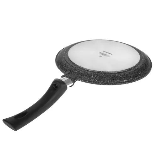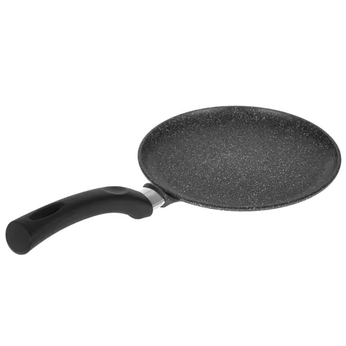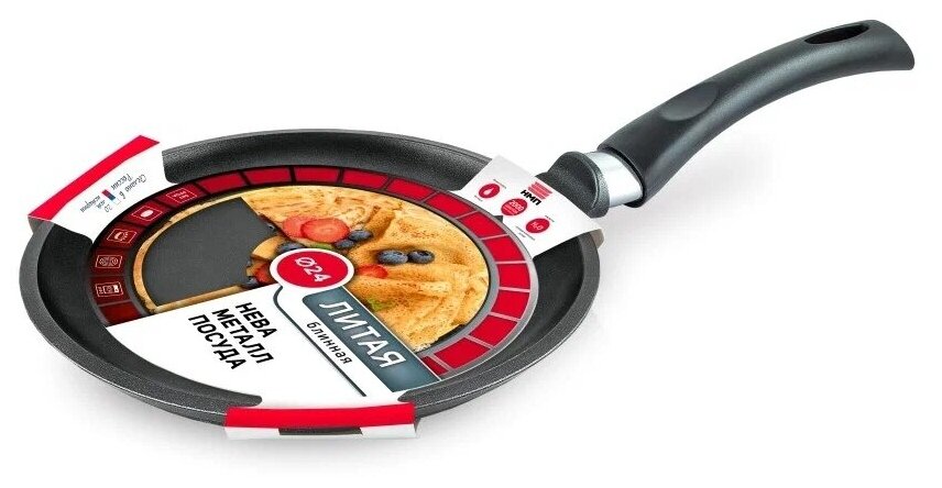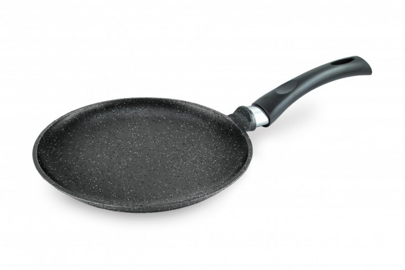 Блинная сковорода имеет низкий борт и удобную ручку, благодаря чему легко переворачивать и снимать блины. Утолщенное дно обеспечивает особые термоаккумулирующие свойства: блин равномерно пропекается по всей толщине и красиво румянится с обеих сторон. Благодаря антипригарному покрытию блины всегда легко соскальзывают со сковороды и не пригорают, даже при выпекании без использования масла.