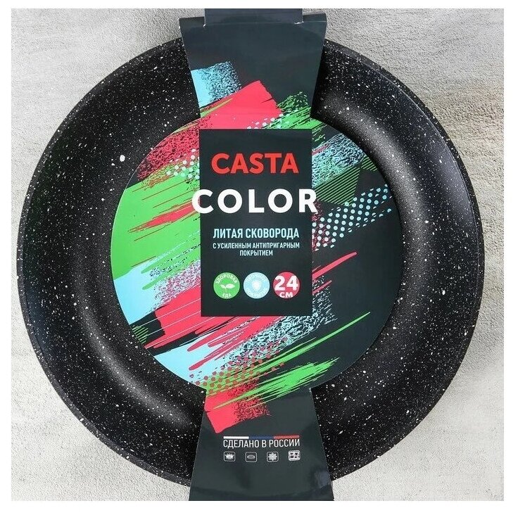 Сковорода CASTA Сolor, глубокая, 24 см, литой алюминий с ультрапрочным пятислойным антипригарным покрытием GMM Dursalete. Покрытие имеет исключительную коррозионную и механическую стойкость, абразивную устойчивость на истирание 18-20 тысяч циклов. Толщина дна - 5 мм, толщина стенки - 2,5 мм Подходит для всех видов плит кроме индукционных. Бакеллитовая ручка не скользит и не нагреваеться во время использования. Можно мыть в посудомоечной машине.
