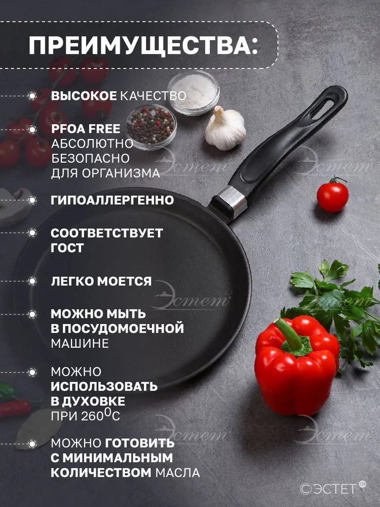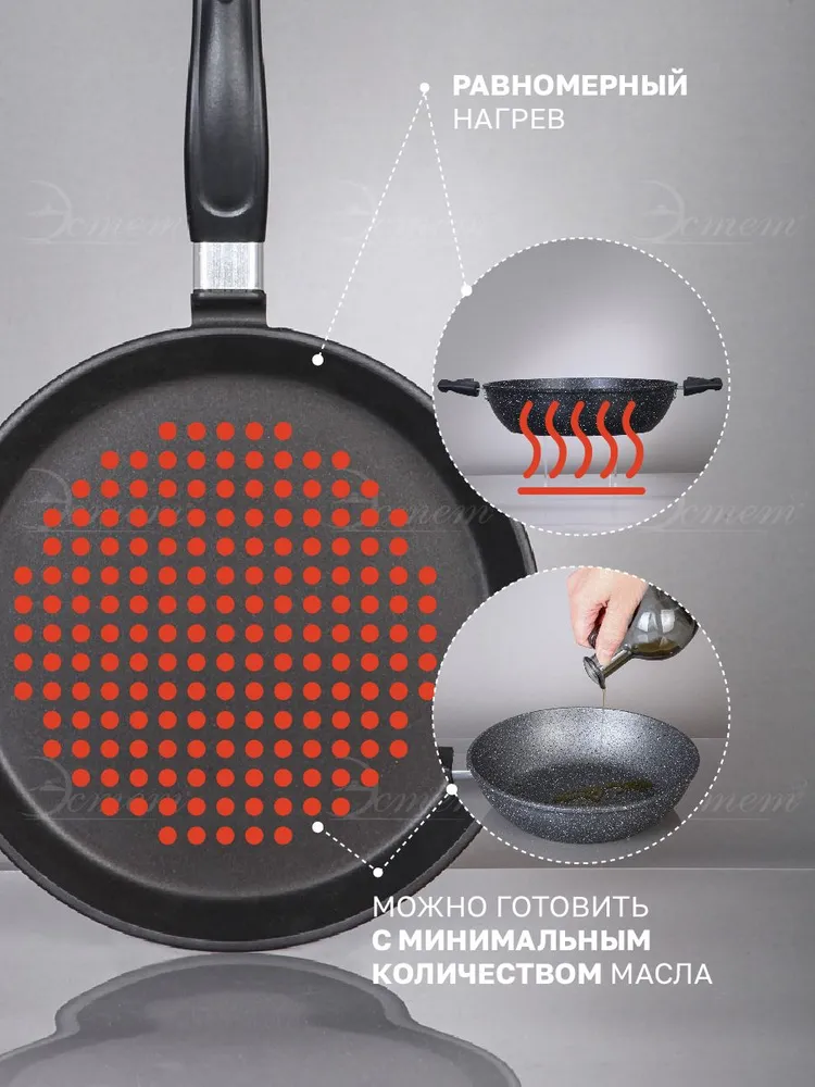 Надежная, как банковский сейф, сковорода серии "Black line" с многослойным антипригарным покрытием QuanTanium обладает высокой отражающей способностью, что придает посуде яркость и привлекательность черного бриллианта. Готовьте блюда с минимальным количеством масла или даже без него - пища не будет пригорать. Антипригарная система QuanTanium от Whitford позволяет нагреть посуду до более высокой температуры, что позволяет сразу зажарить продукты до хрустящей корочки, а потом потомить до готовности. Покрытие усилено частицами титана, которые обеспечивают высокую стойкость к царапинам и истиранию, даже при частом использовании. Покрытие не содержит PFOA (перфтороктановую кислоту), поэтому безопасно для человека. Можно мыть в посудомоечной машине. Посуда марки "Эстет" отвечает всем требованиям качества, безопасности и долговечности.