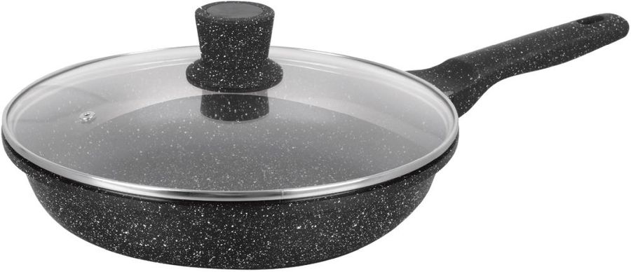 Описание: Сковорода из литого алюминия со стеклянной крышкой. 3-х слойное антипригарное мраморное покрытие, 5-ти слойное теплоаккумулирующее дно.