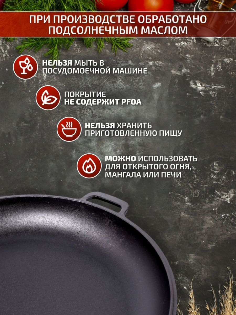 Литая чугунная посуда изготовлена по традиционной технологии литья чугуна в кокиль. Общепризнанно посуда из чугуна является лучшей для приготовления пищи. Она аккумулирует и выделяет тепло на протяжении длительного периода времени. Экологически чистая, естественная среда позволяет приготовить максимально насыщенные и вкусные блюда.
