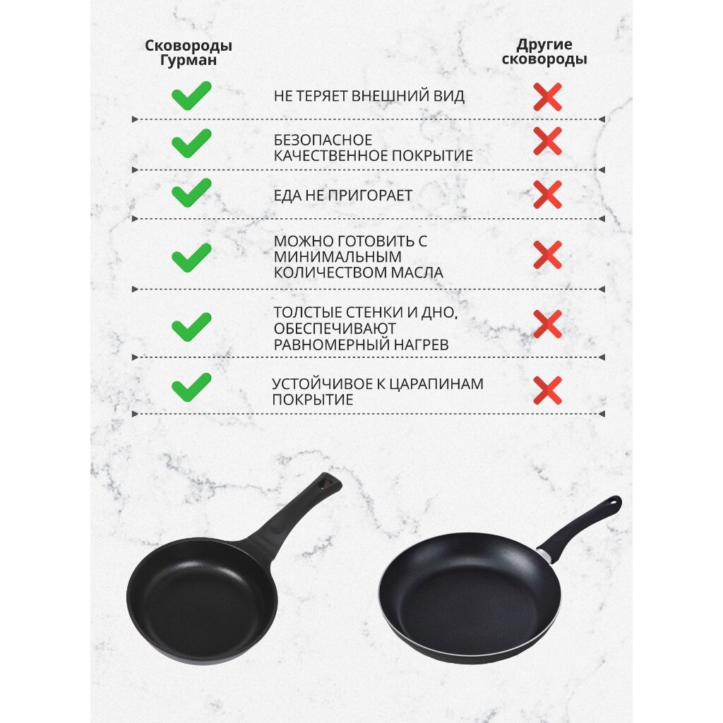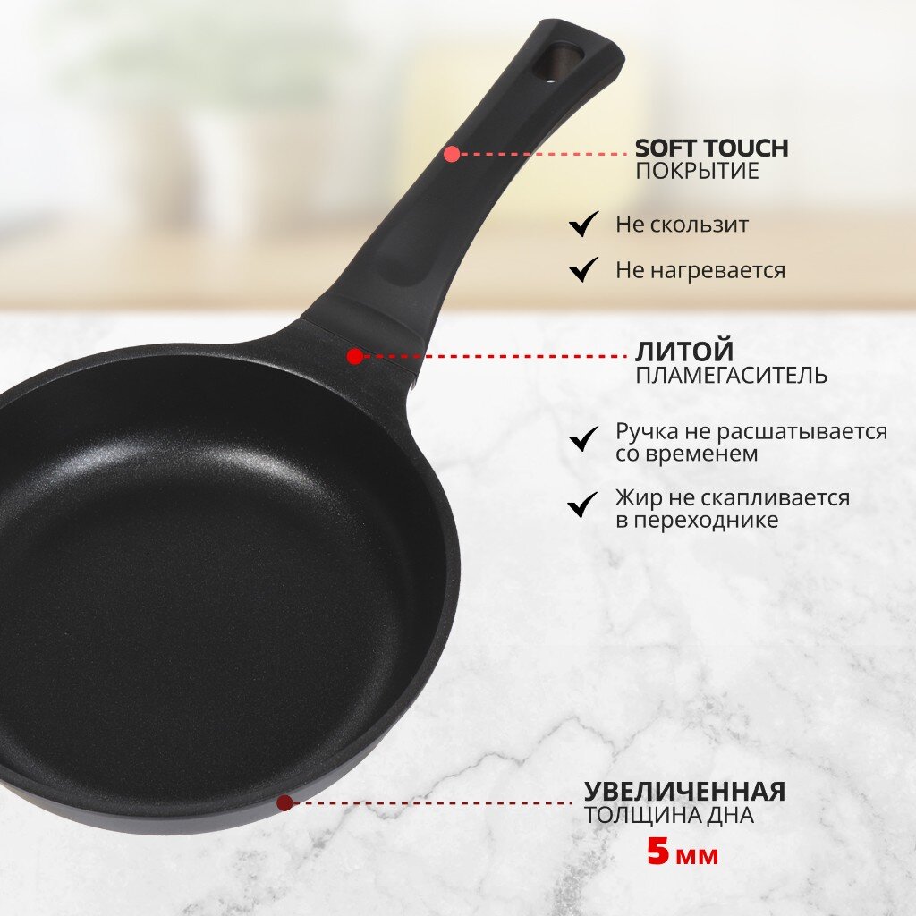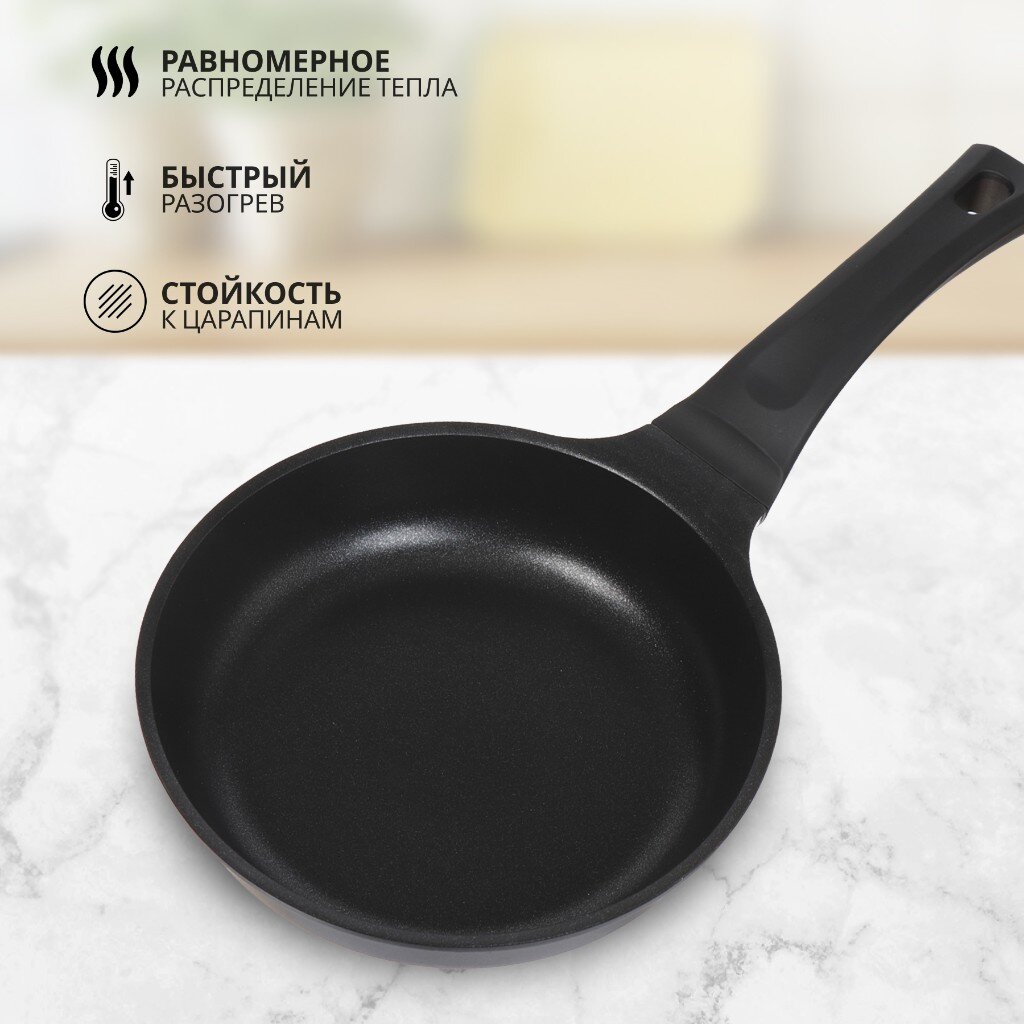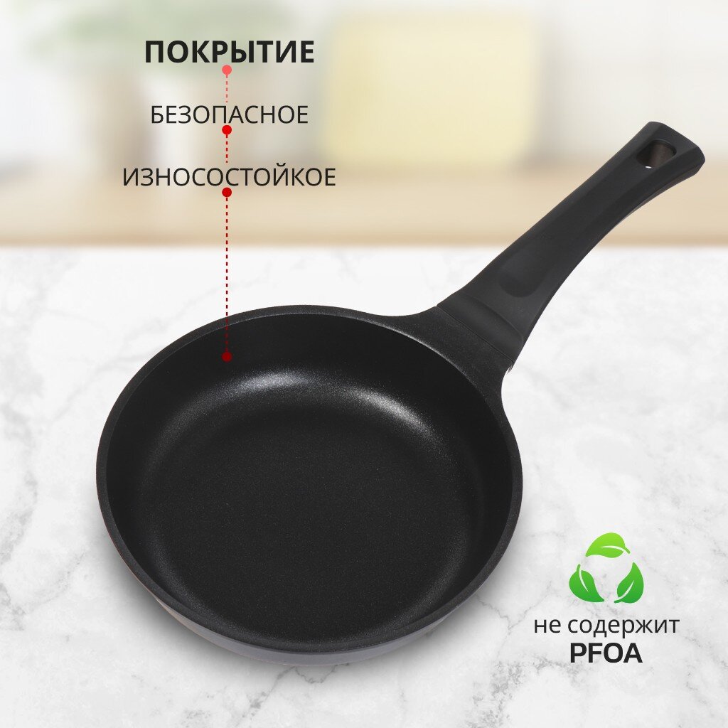 Сковорода выполнена литьем вручную из пищевого алюминия и имеет сверхпрочное семислойное антипригарное покрытие, безопасное для здоровья. Антипригарное покрытие обладает высокой прочностью к истиранию, что увеличивает срок службы сковороды в 5 раз. Форма сковороды обеспечивает устойчивость к деформации при длительном использовании. Дно оптимальной толщины 3 мм способствует равномерному распределению тепла для наилучшего приготовления ваших блюд. Сковорода имеет удобную ручку, которая не нагревается при эксплуатации. Посуда легко и быстро моется благодаря гладкой непористой поверхности. Сковорода не содержит PFOA, при нагревании не выделяются вредные токсичные и канцерогенные вещества.