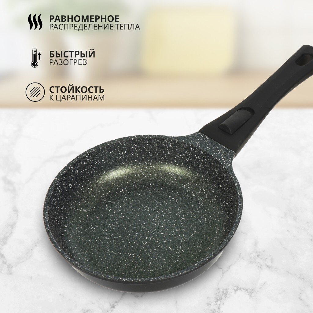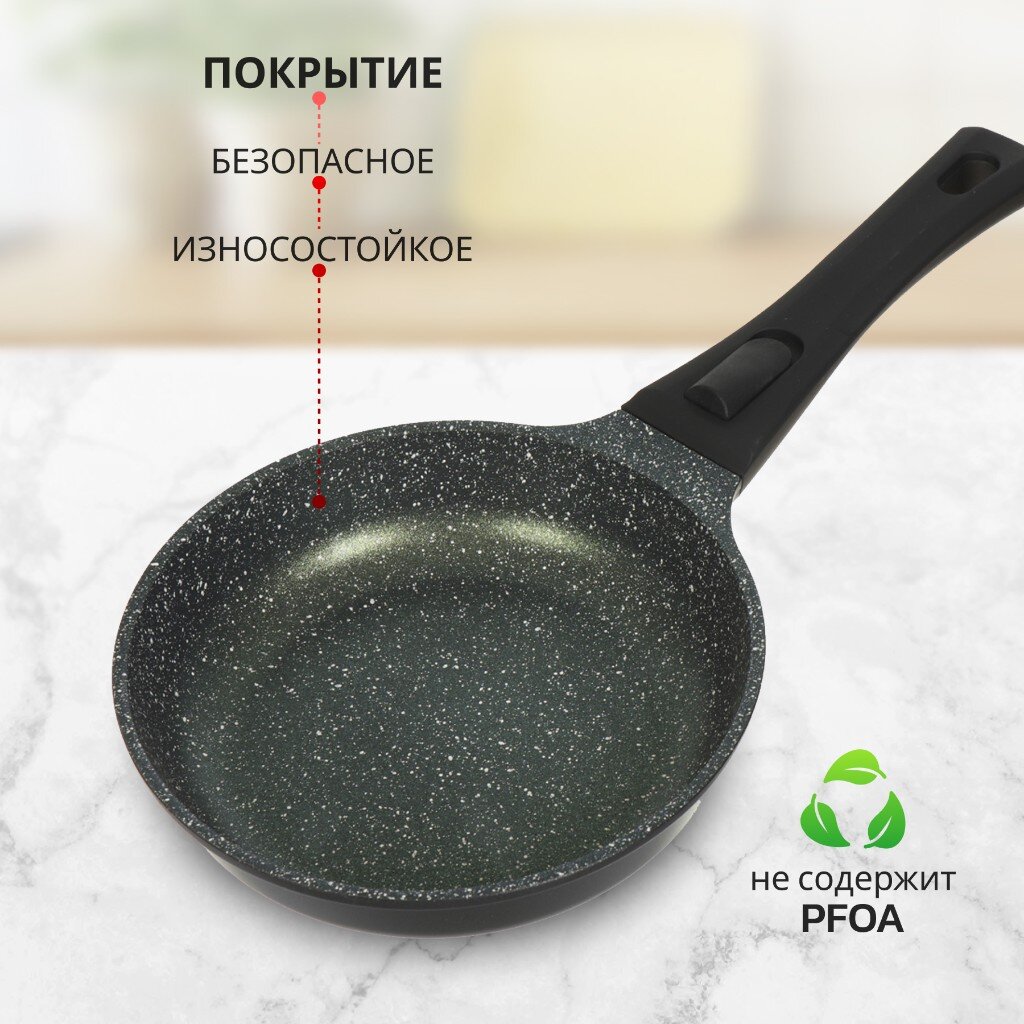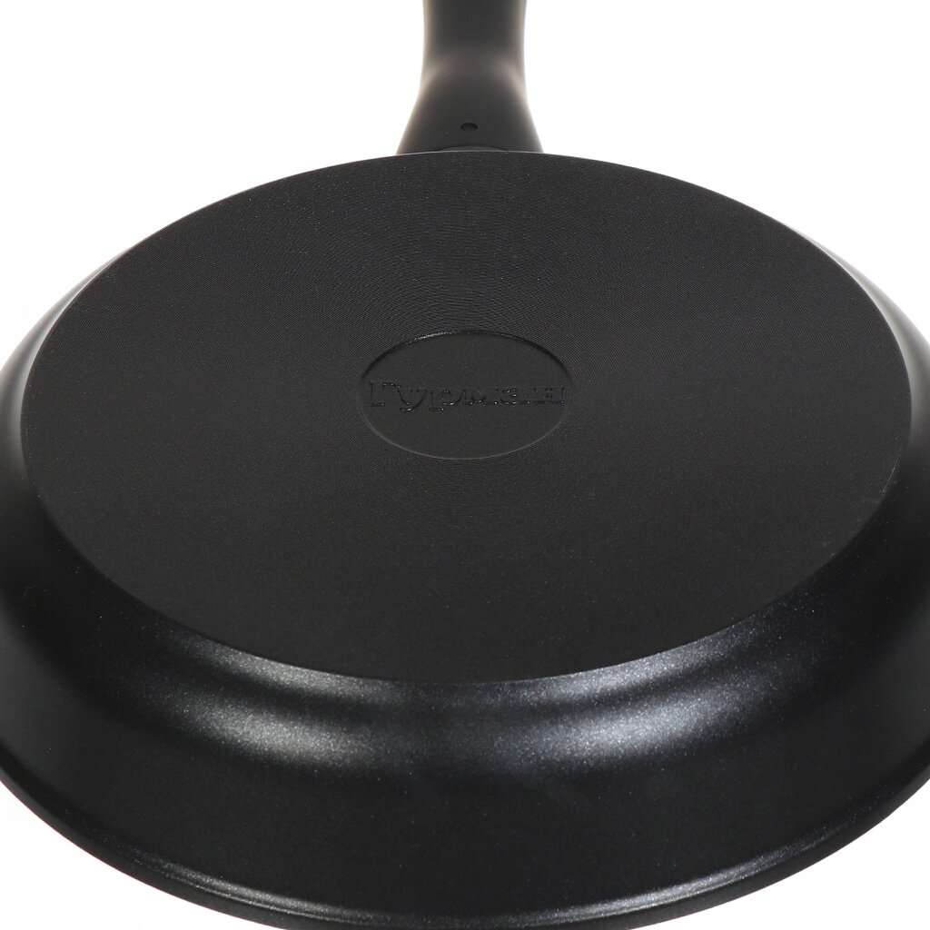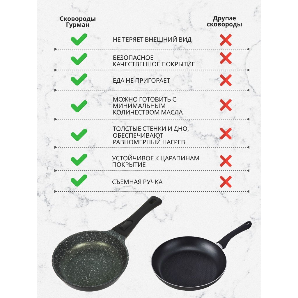 Сковорода выполнена литьем вручную из пищевого алюминия и имеет сверхпрочное семислойное антипригарное покрытие, безопасное для здоровья. Антипригарное покрытие обладает высокой прочностью к истиранию, что увеличивает срок службы сковороды в 5 раз. Форма сковороды обеспечивает устойчивость к деформации при длительном использовании. Дно оптимальной толщины 5 мм способствует равномерному распределению тепла для наилучшего приготовления ваших блюд. Сковорода имеет удобную ручку, которая не нагревается при эксплуатации. Посуда легко и быстро моется благодаря гладкой непористой поверхности. Сковорода не содержит PFOA, при нагревании не выделяются вредные токсичные и канцерогенные вещества.