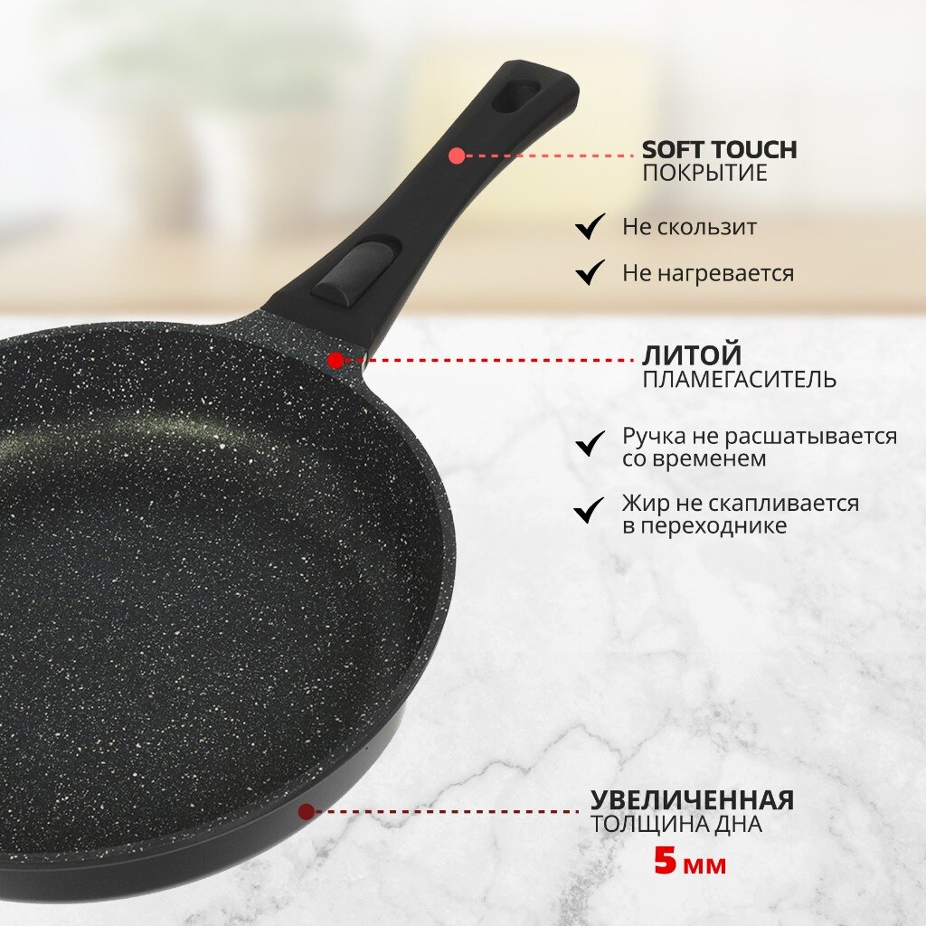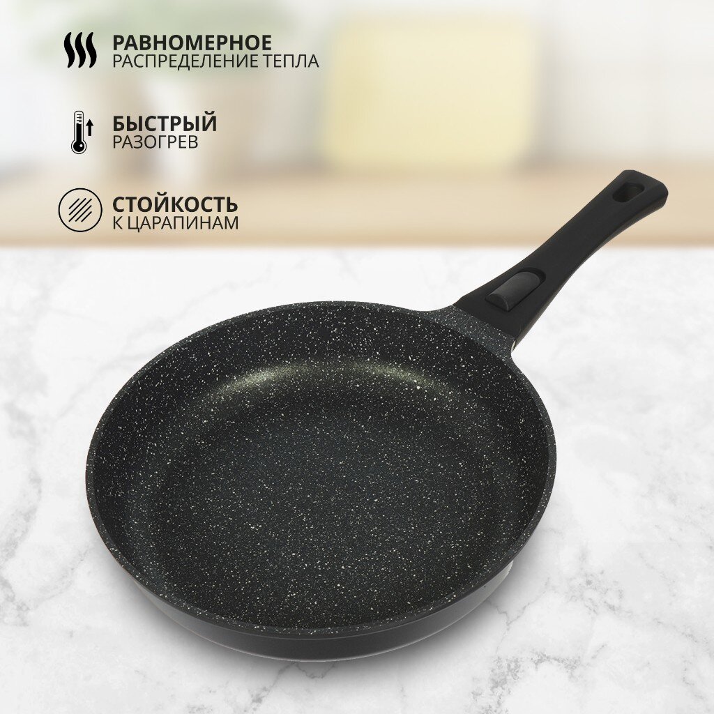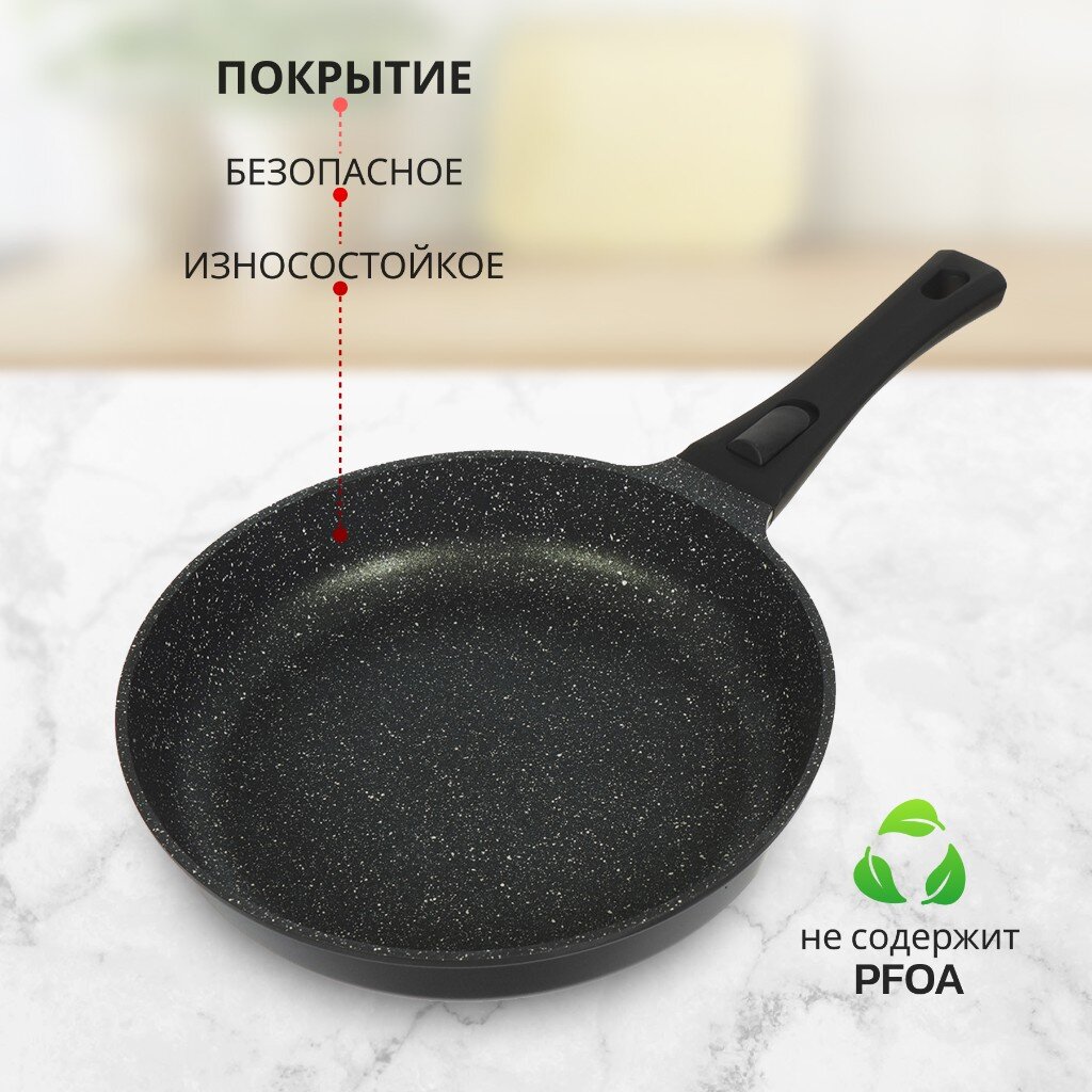 Сковорода выполнена литьем вручную из пищевого алюминия и имеет сверхпрочное семислойное антипригарное покрытие, безопасное для здоровья. Антипригарное покрытие обладает высокой прочностью к истиранию, что увеличивает срок службы сковороды в 5 раз. Форма сковороды обеспечивает устойчивость к деформации при длительном использовании. Дно оптимальной толщины 5 мм способствует равномерному распределению тепла для наилучшего приготовления ваших блюд. Сковорода имеет удобную ручку, которая не нагревается при эксплуатации. Посуда легко и быстро моется благодаря гладкой непористой поверхности. Сковорода не содержит PFOA, при нагревании не выделяются вредные токсичные и канцерогенные вещества.