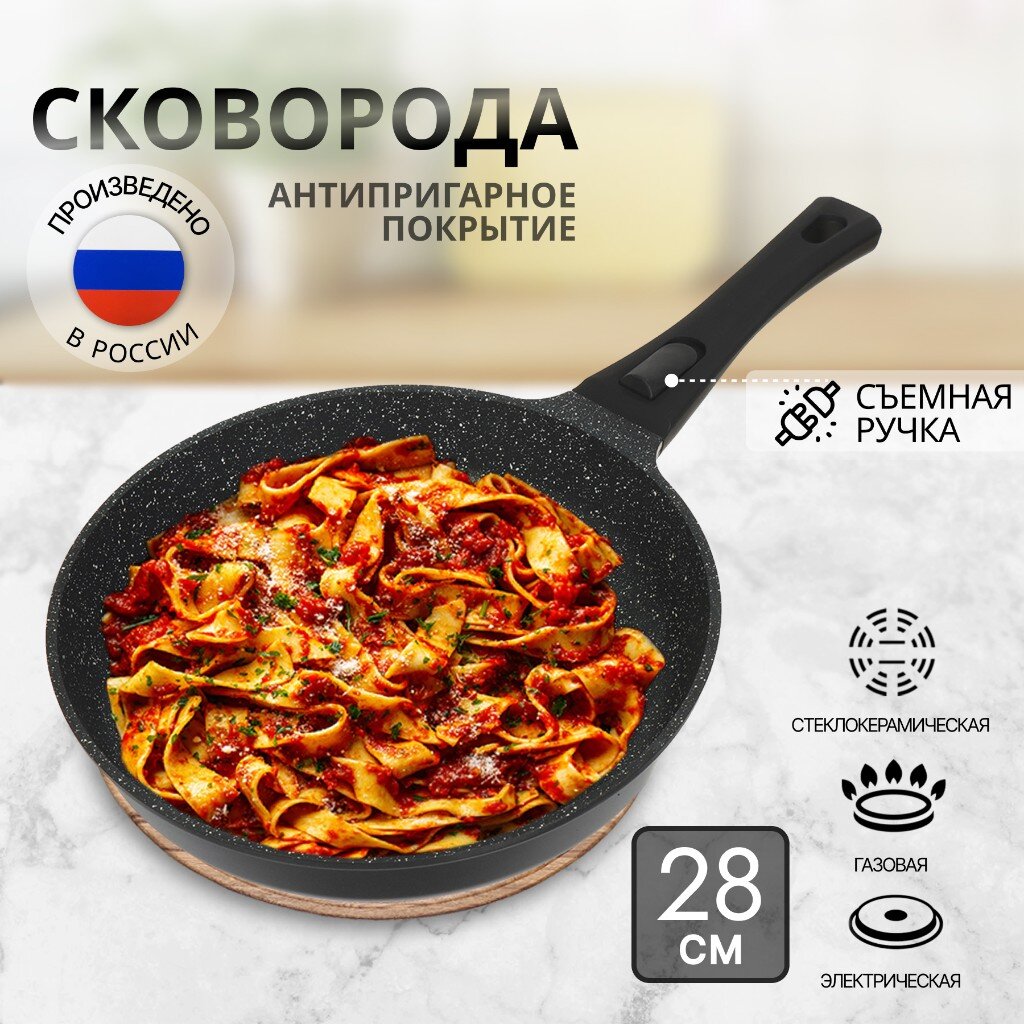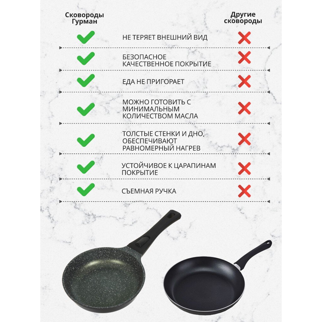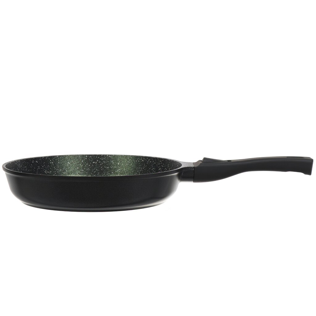 Сковорода выполнена литьем вручную из пищевого алюминия и имеет сверхпрочное семислойное антипригарное покрытие, безопасное для здоровья. Антипригарное покрытие обладает высокой прочностью к истиранию, что увеличивает срок службы сковороды в 5 раз. Форма сковороды обеспечивает устойчивость к деформации при длительном использовании. Дно оптимальной толщины 5 мм способствует равномерному распределению тепла для наилучшего приготовления ваших блюд. Сковорода имеет удобную ручку, которая не нагревается при эксплуатации. Посуда легко и быстро моется благодаря гладкой непористой поверхности. Сковорода не содержит PFOA, при нагревании не выделяются вредные токсичные и канцерогенные вещества.
