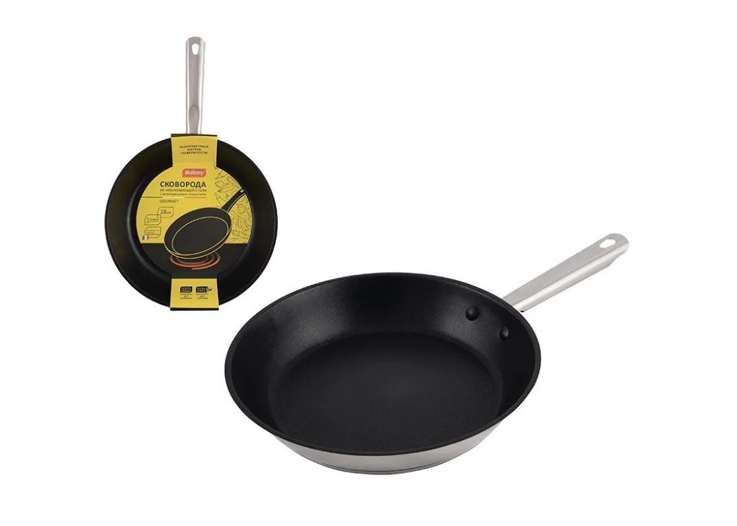 Сковорода Gourmet из нержавеющей стали с антипригарным покрытием, диа 28 см Размер: 28*5,3 см, толщина стенок 0,5 мм, диаметр 28 см, дно 5-ти слойное капсулированное (антипригарное покрытие (whiteford xylon (2 слоя)+0,5 мм алюминий +1 мм железо + 0,5 мм алюминий + 430 сталь (база). Подходит для всех типов плит. Зеркальная полировка. Ручка полая из нерж стали. Упаковка: Цветной рукав+ пакет.
