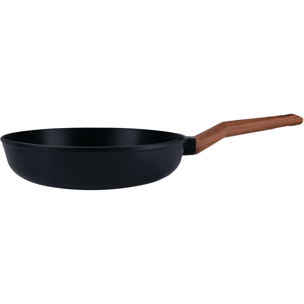 Сковорода выполнена в классическом черном цвете, ручка с отделкой под дерево, будет отлично сочетаться с любой кухней.
