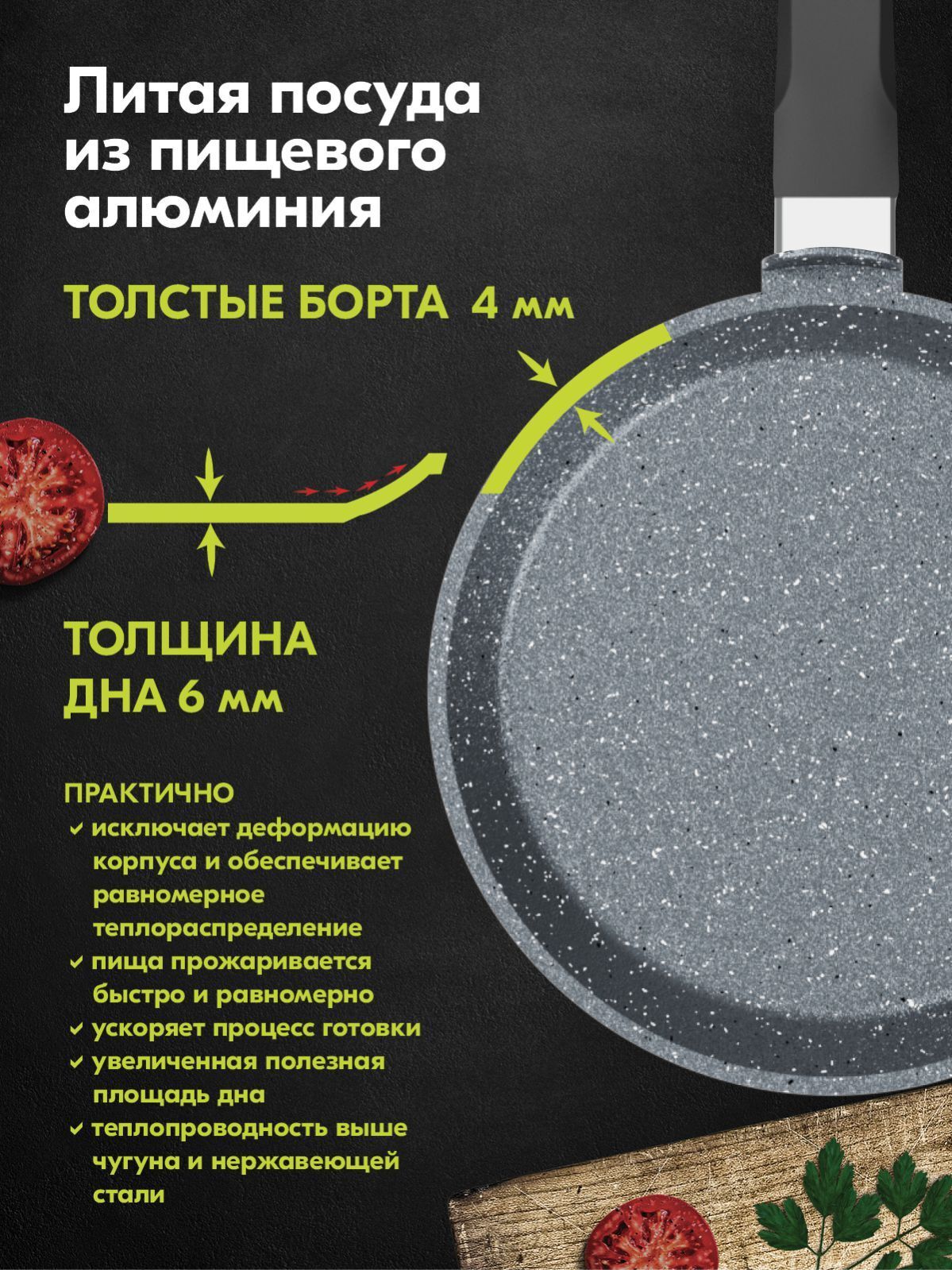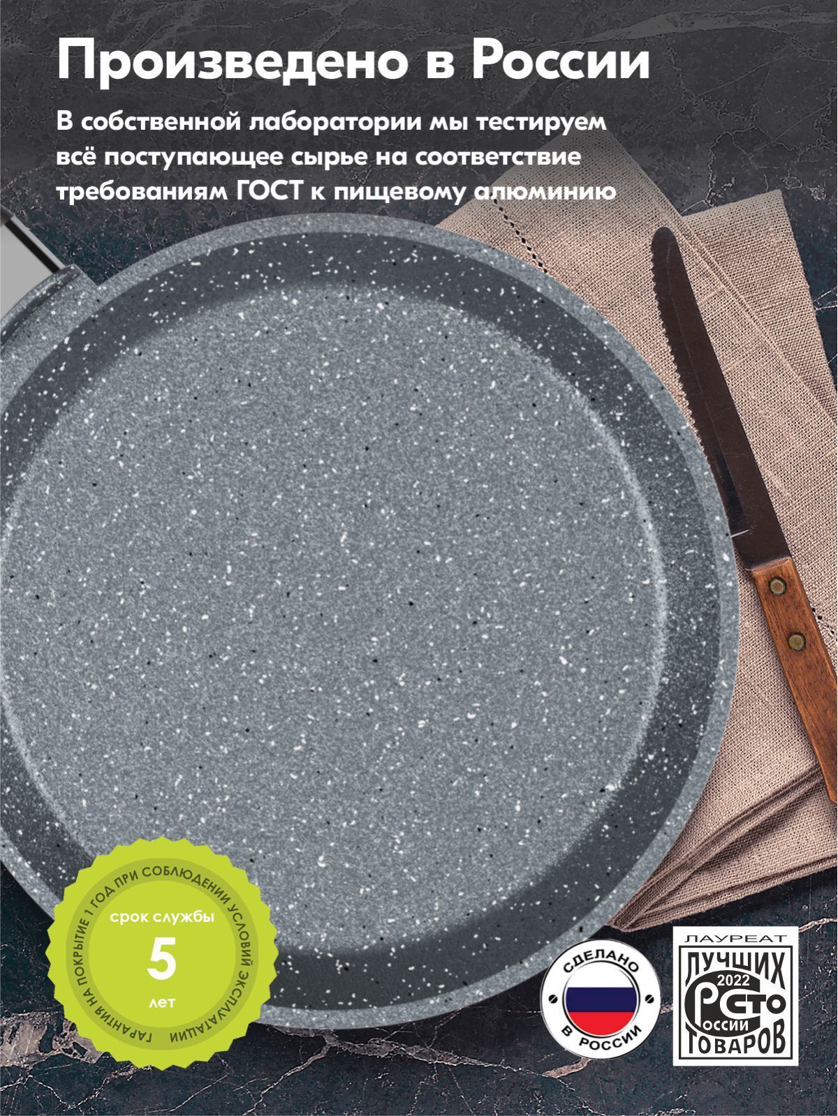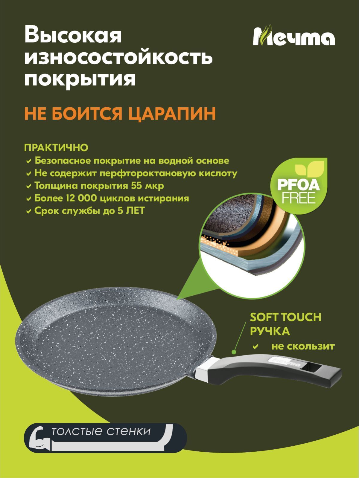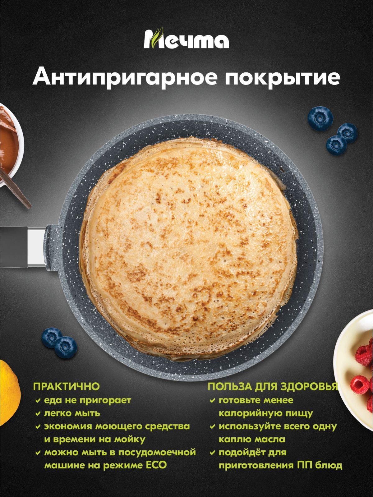 Сковорода-блинница изготовлена из прочного и легкого сплава пищевого алюминия. Это один из самых высококачественных и экологических материалов для производства посуды, обладает высокой тепловой проводимостью и обеспечивает равномерный нагрев. Сверхпрочное антипригарное покрытие отличается особой износостойкостью и превосходными антипригарными свойствами, рассчитано на интенсивное использование в течение длительного срока. Массивное дно и стенки блинницы не подвержены деформации, царапинам и сколам за счет применения особой технологии производства. Посуда линейки Гранит от торговой марки Мечта подходит для газовых, электрических, стеклокерамических плит и мытья в посудомоечной машине (согласно инструкции по эксплуатации).