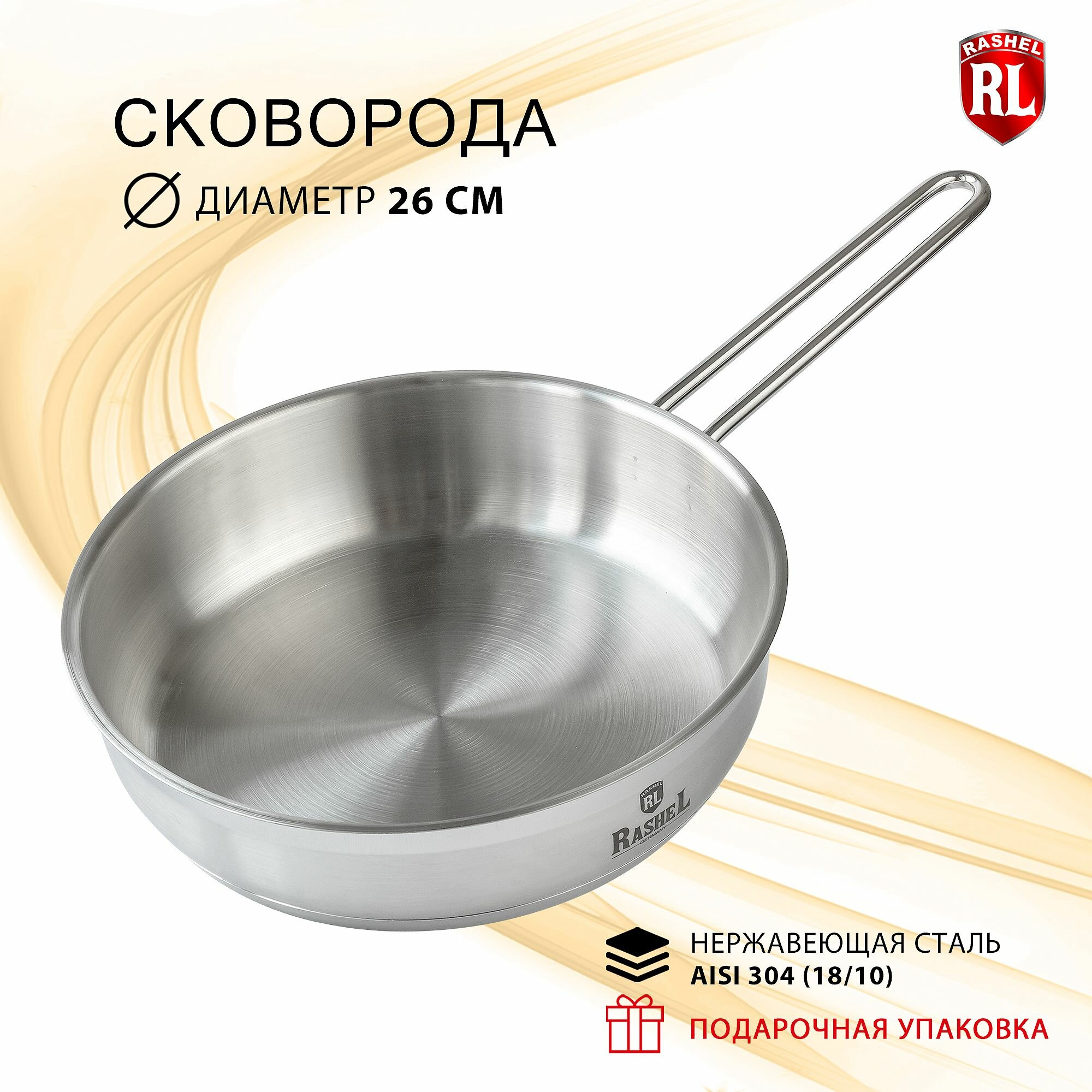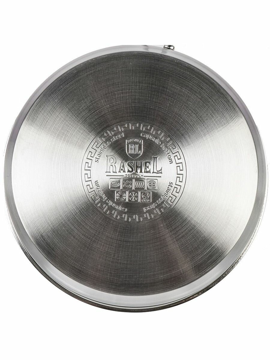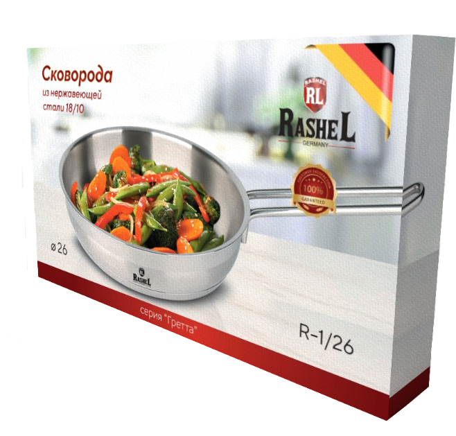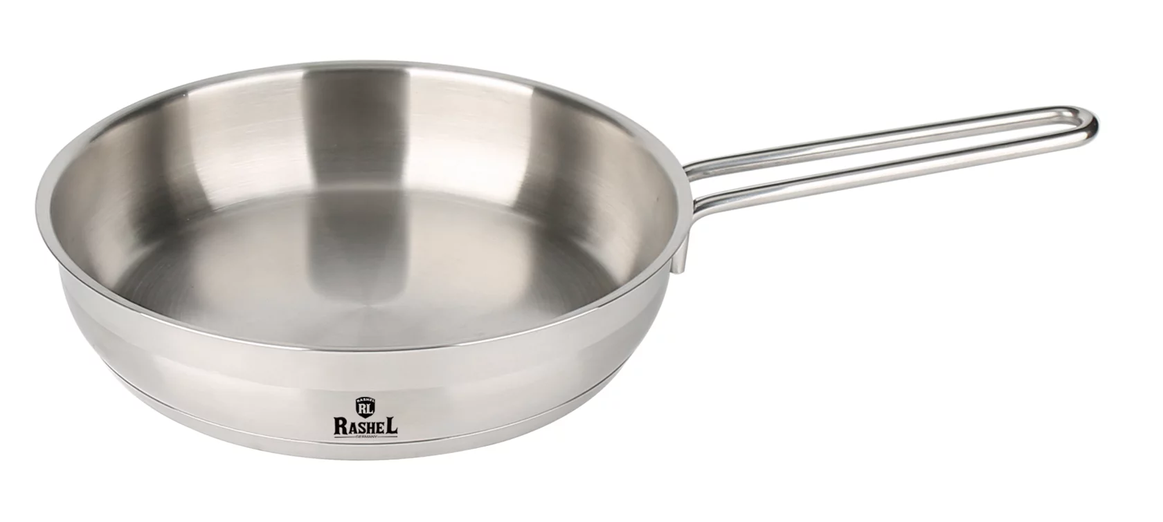 Сковороды торговой марки "RASHEL" выполнены из высококачественной нержавеющей стали (18/10 - соотношение хром/никель). Сковороды удобны в использовании, за ними легко и просто ухаживать. Многослойное капсульное дно равномерно распределяет тепло и долгое время сохраняет достигнутую температуру, тем самым обеспечивает равномерный нагрев и равномерную подачу тепла во внутрь кастрюли.