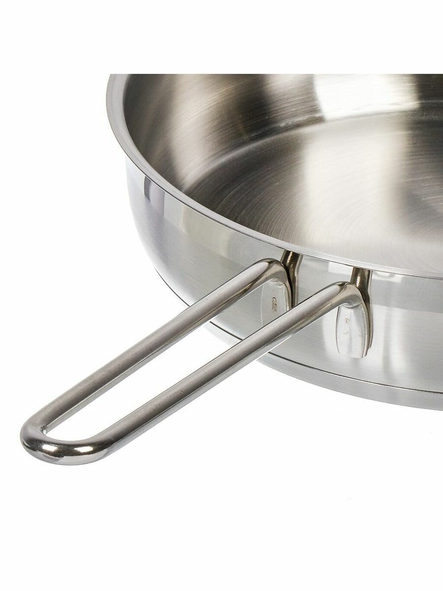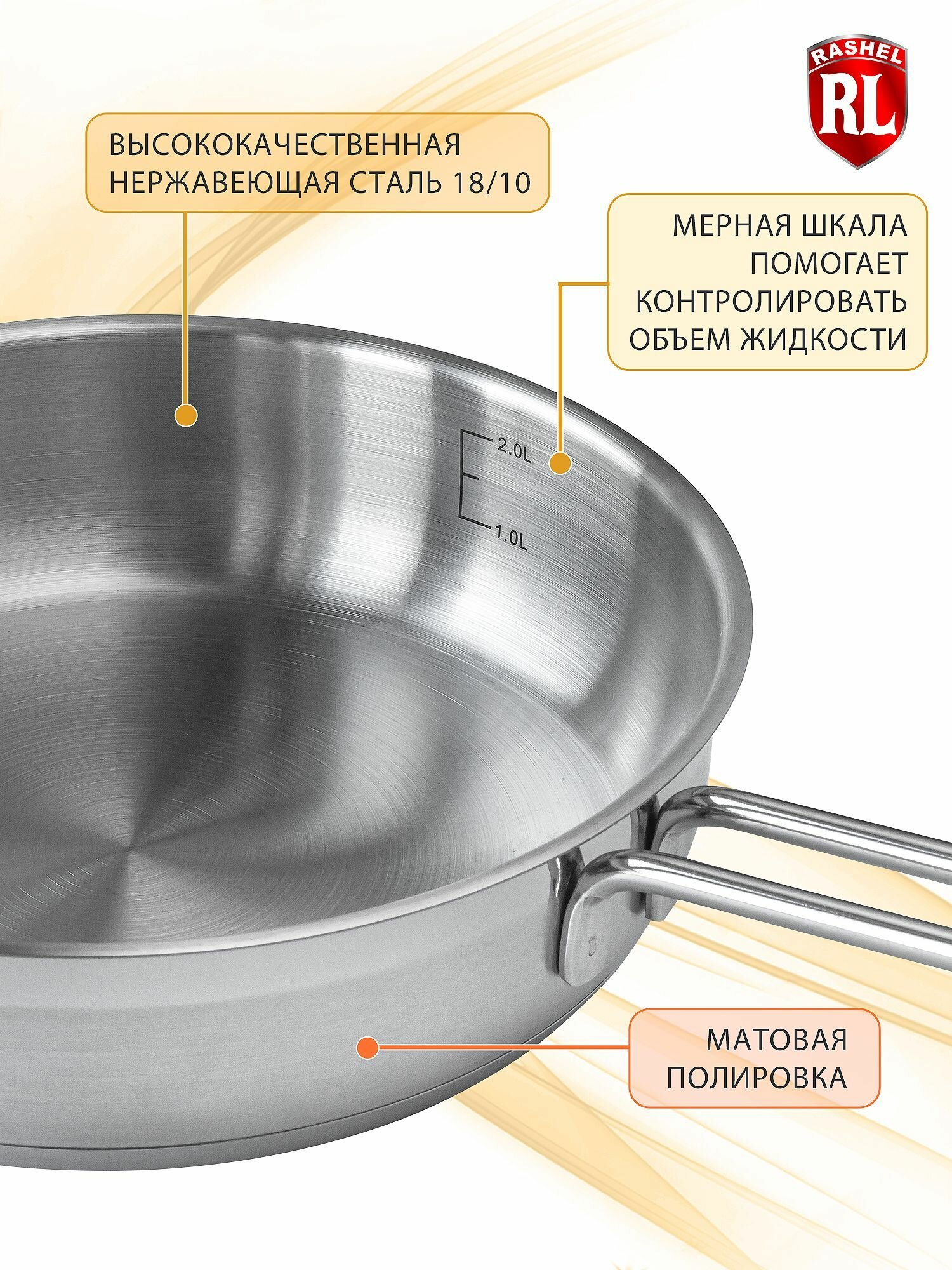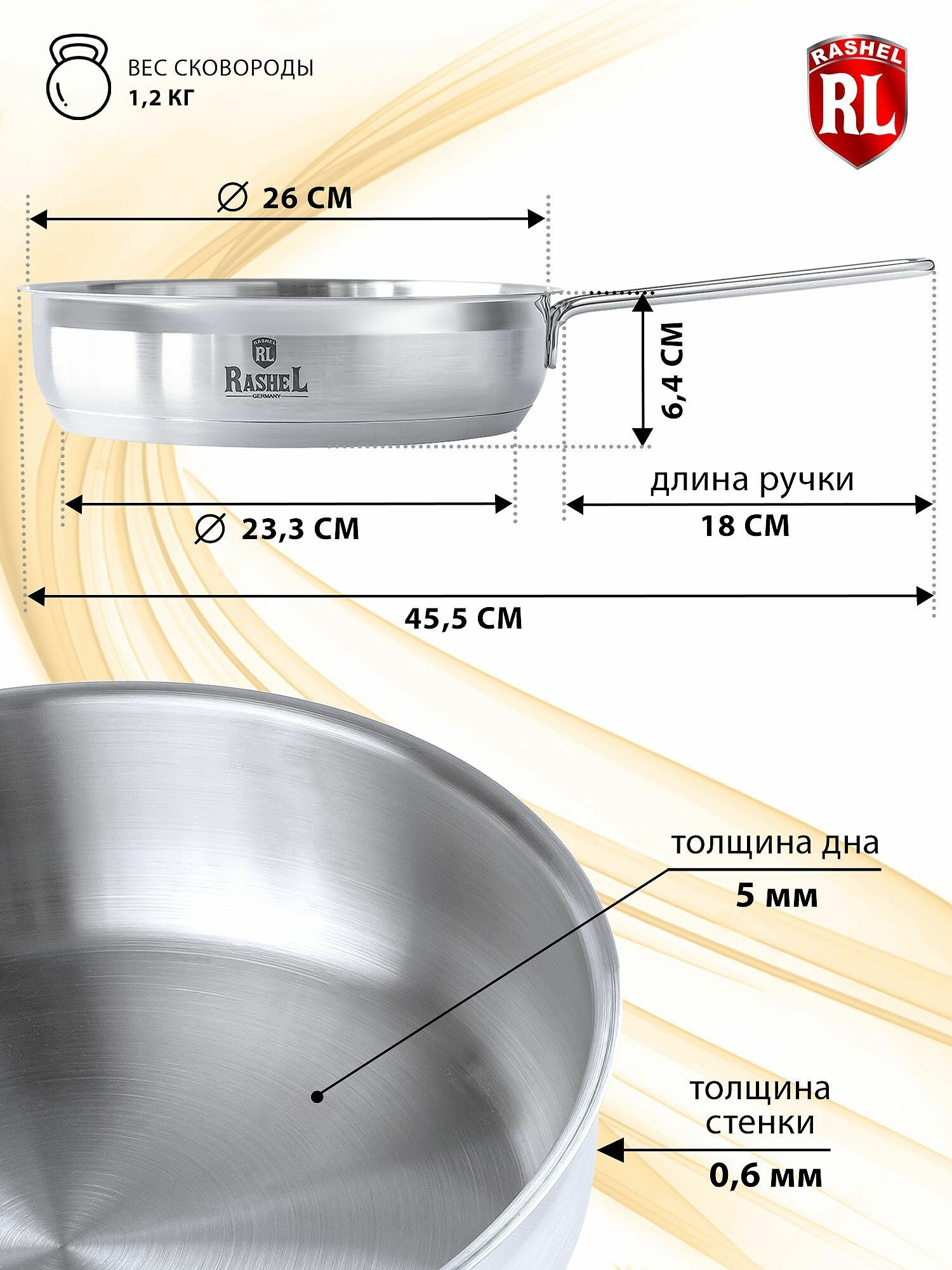 Сковороды торговой марки "RASHEL" выполнены из высококачественной нержавеющей стали (18/10 - соотношение хром/никель). Сковороды удобны в использовании, за ними легко и просто ухаживать. Многослойное капсульное дно равномерно распределяет тепло и долгое время сохраняет достигнутую температуру, тем самым обеспечивает равномерный нагрев и равномерную подачу тепла во внутрь кастрюли.