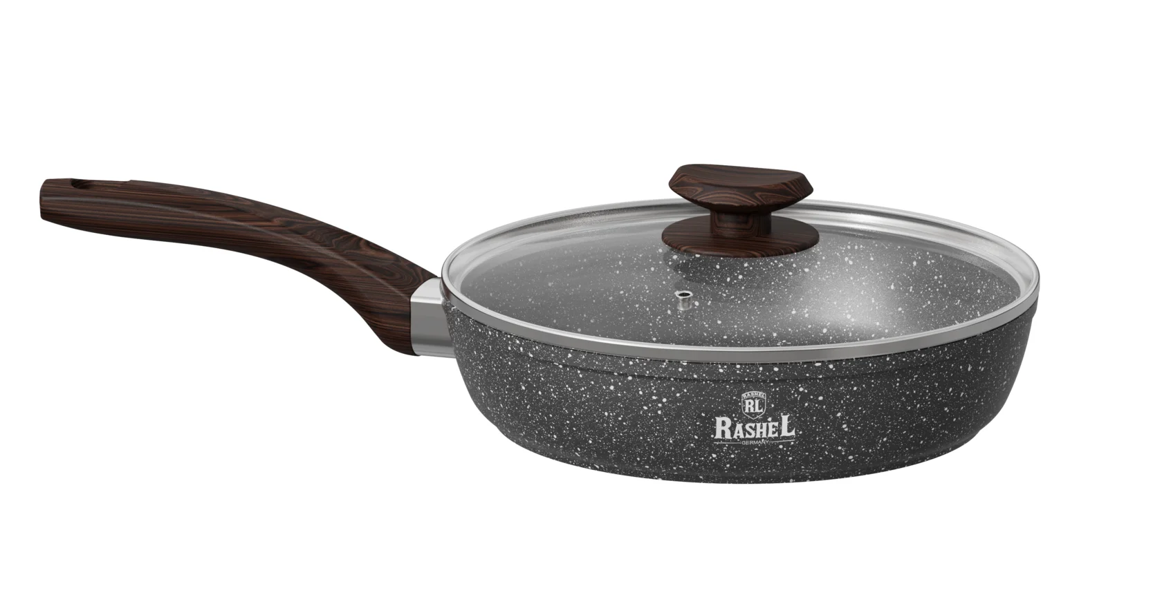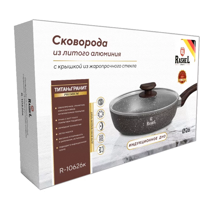 Сковороды ТМ RASHEL выполнены из высококачественного пищевого алюминия.Внутреннее и внешнее сверхпрочное, гранитное, антипригарное покрытие ТИТАН&ГРАНИТ.