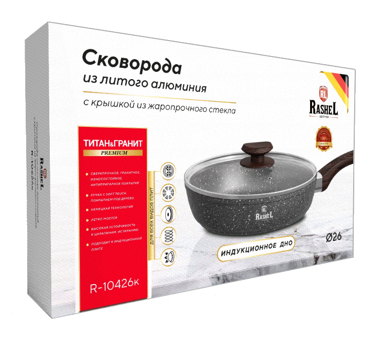 Сковороды ТМ RASHEL выполнены из высококачественного пищевого алюминия.Внутреннее и внешнее сверхпрочное, гранитное, антипригарное покрытие ТИТАН&ГРАНИТ.