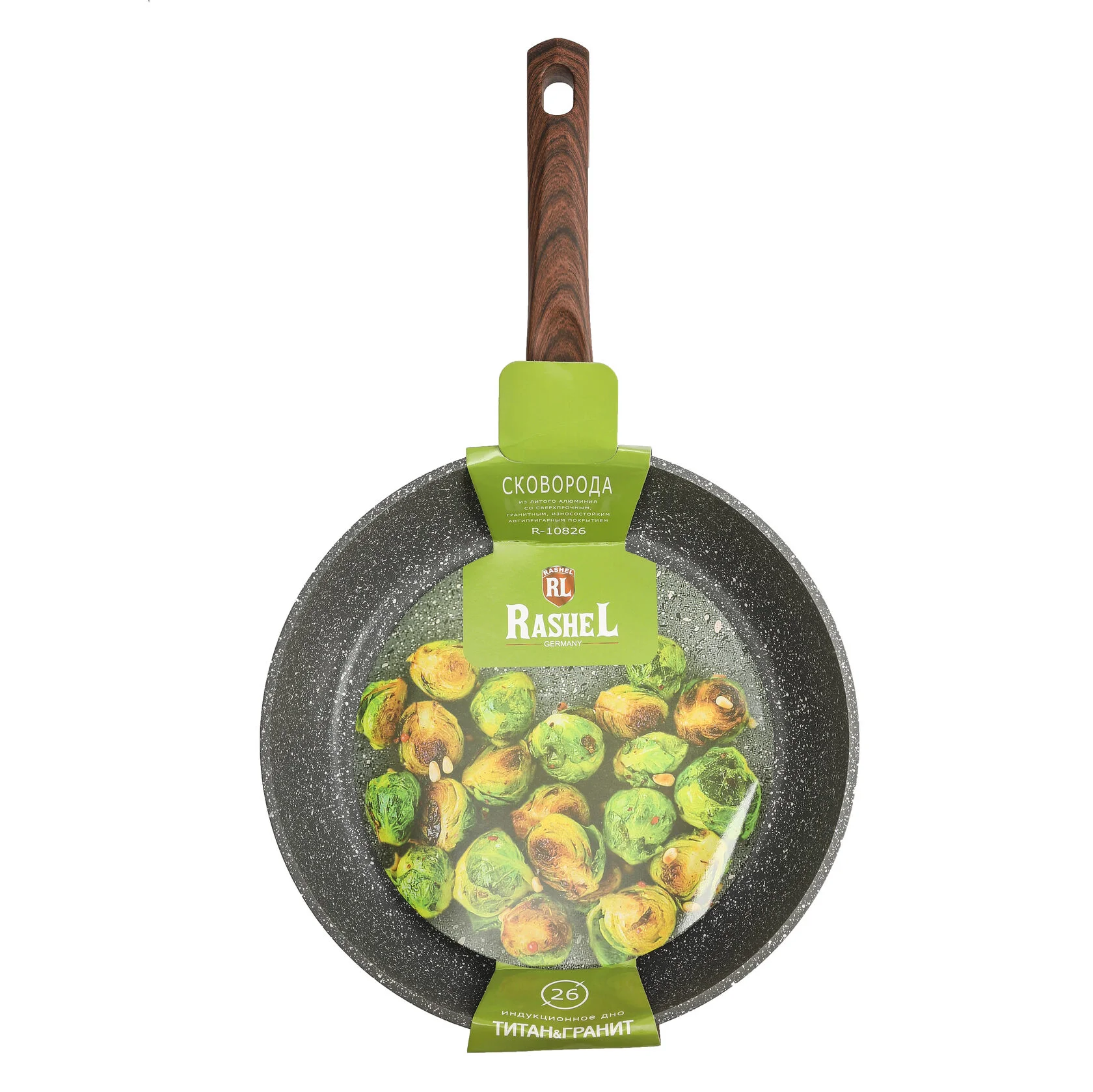 Сковороды ТМ RASHEL выполнены из высококачественного пищевого алюминия. Внутреннее и внешнее сверхпрочное, гранитное, антипригарное покрытие ТИТАН&ГРАНИТ.