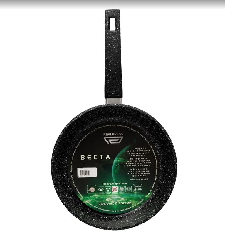 Сковорода REALPRESS 28 см серии ВЕСТА с несъемной ручкой изготовлена в России из литого алюминия с многослойным антипригарным покрытием.