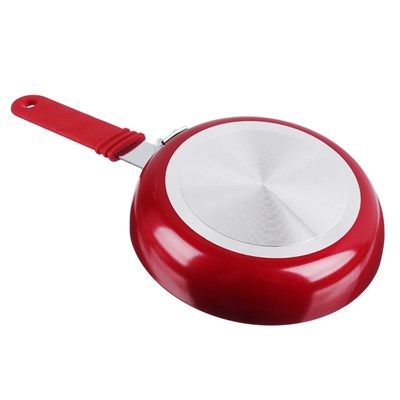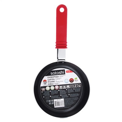 Мини-сковорода диаметром 14 см из углеродистой стали с 2х слойным антипригарным покрытием черного цвета изнутри и покрытием красного цвета снаружи, с ручкой в силиконовой оболочке и однослойным дном - подходит для использования на всех видах плит, кроме индукции.
