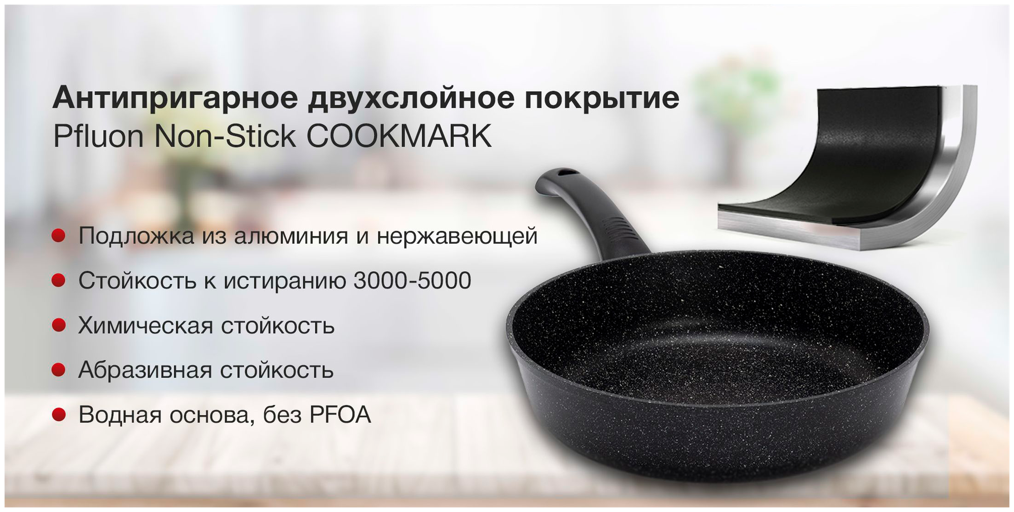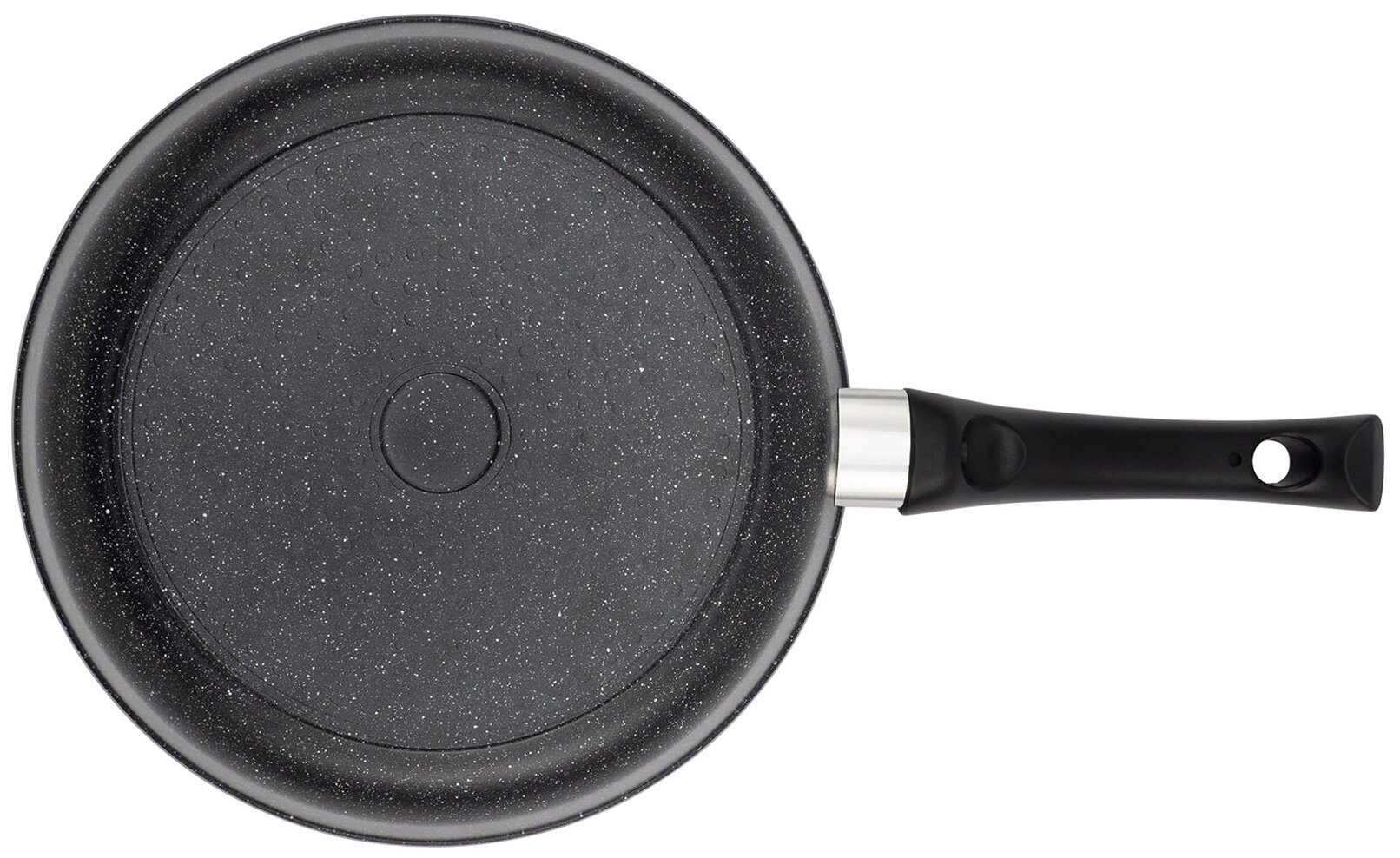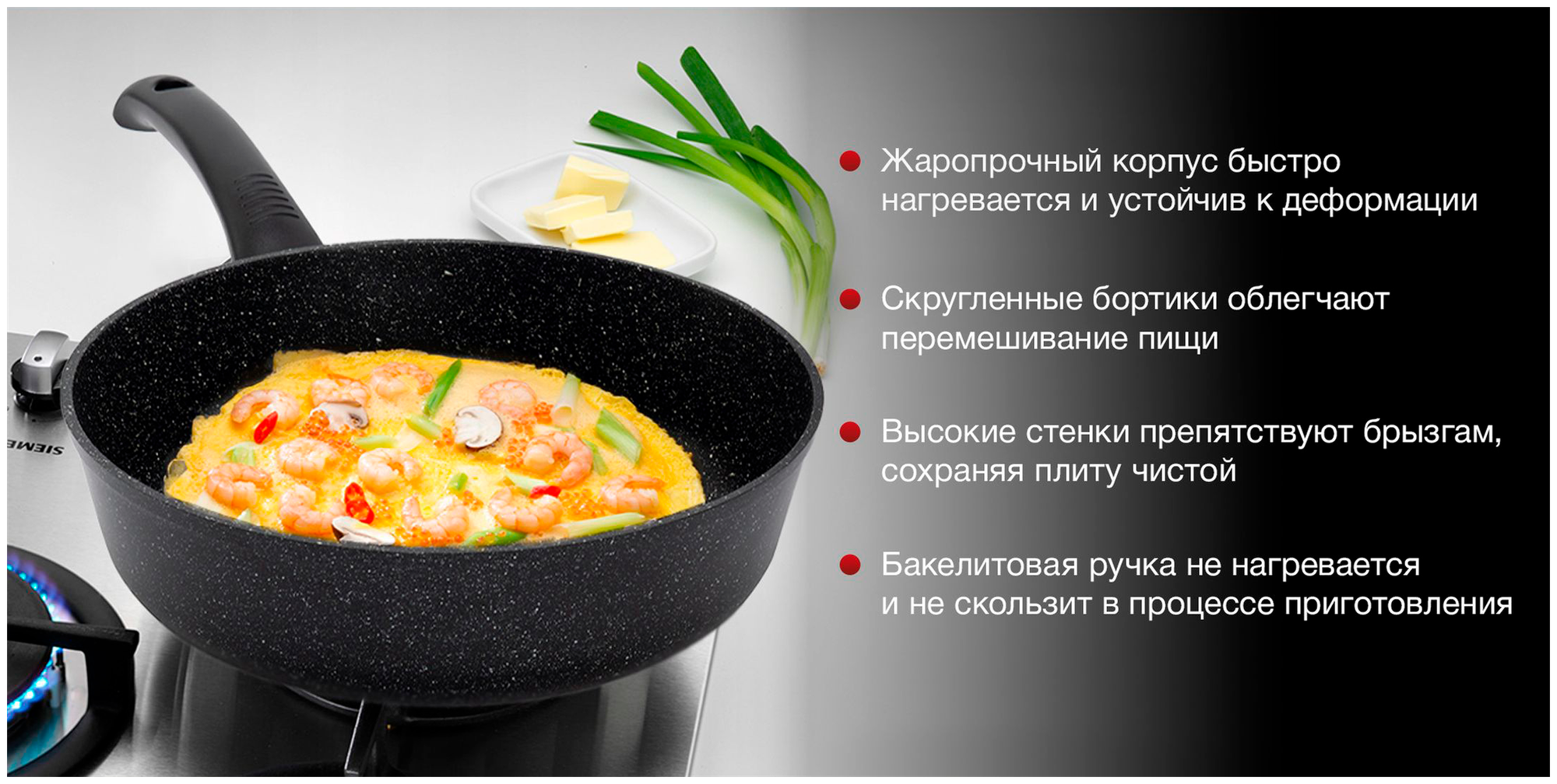 Диаметр сковороды — 26 см, диаметр дна — 20 см, такая конфигурация делает её универсальным вариантом для приготовления самых разных блюд, от воков до сложных и изысканных деликатесов. Внутреннее покрытие данной модели из двух слоёв инновационного и экологичного покрытия Pfulon позволяет проводить тепловую обработку любых продуктов без риска пригорания. Он устойчив к царапинам и химически стабилен, то есть не повлияет на вкус и пользу пищи. Сковорода идеально подходит для готовки на индукционных плитах, при этом мыть её можно как в посудомоечной машине, так и вручную, используя только губку и чистящее средство.