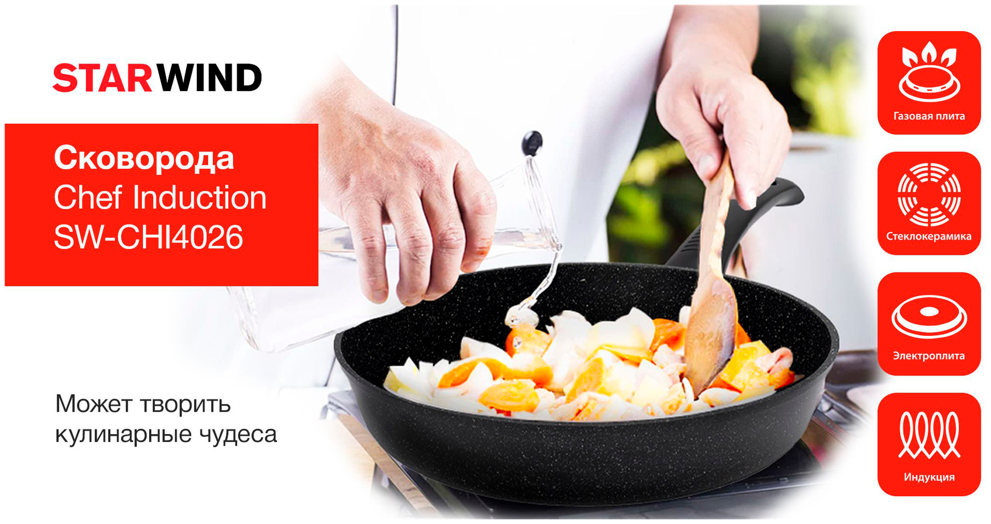 Starwind Chef Induction SW-CHI4026 — это круглая сковорода с высокотехнологичным антипригарным покрытием в лаконичном и классическом чёрном цвете.