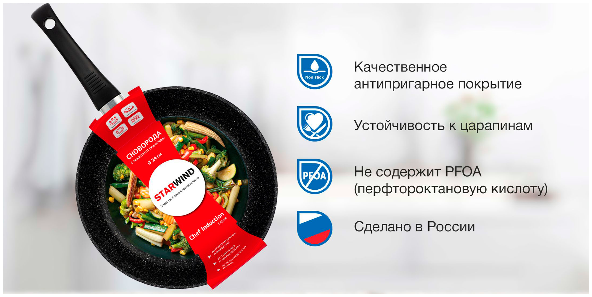 Корпус Starwind Chef Induction SW-CHI4026 изготовлен из литого алюминия — это лёгкий материал, который обеспечивает отличные характеристики теплопроводности и долго держит жар. Его можно хранить в холодильнике, а также он устойчив к деформации даже при использовании в условии высоких температур. Сковорода подходит как для быстрой обжарки овощей, морепродуктов, курицы и рыбы, так и для тушения и длительного томления.