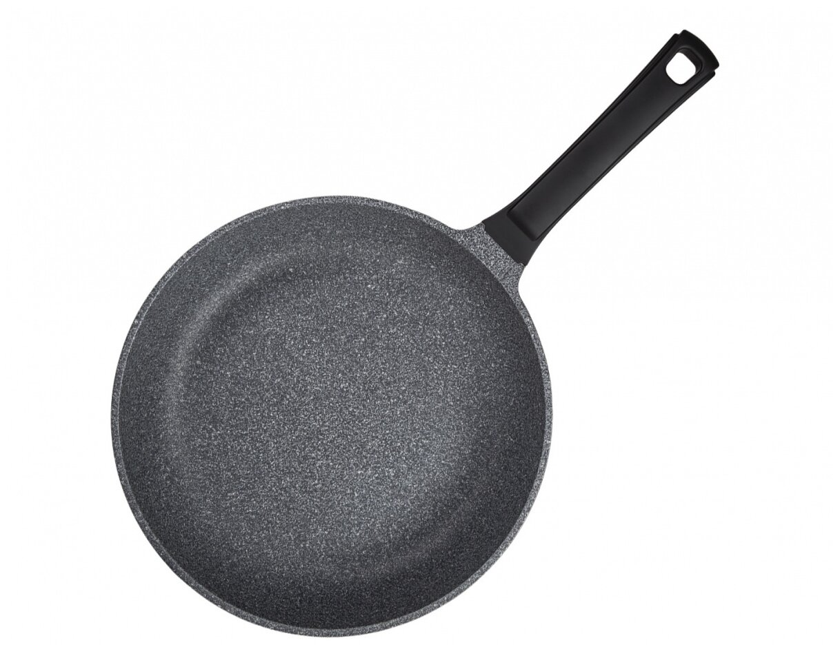 Сковорода из литого алюминия TR-44254. Внешнее покрытие устойчиво к высоким температурам и загрязнениям и долго сохраняет превосходный внешний вид. Трехслойное немецкое рифленое антипригарное покрытие Greblon C3, стилизованное под гранит.